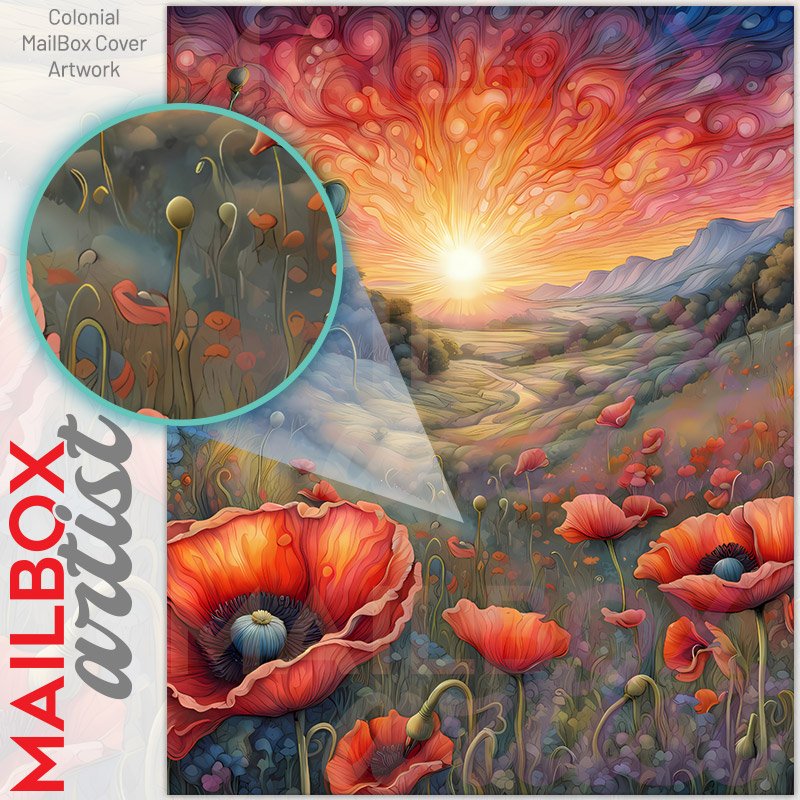 With this Poppies in the Meadow colonial mailbox cover it’s pretty easy to convert your mailbox to a special and unique item. These covers require a flat surface, so they work with colonial mailboxes that do not have any embossed decoration or signs. Magnetic mailbox covers work with steel colonial boxes only, while self-adhesive vinyl covers are available for aluminum, plastic and steel boxes. We also offer both self-adhesive and magnetic covers with regular opaque white vinyl or reflective vinyl, which works similarly to license plates or road signs. The reflective option makes the entire cover’s surface reflective, ensuring visibility at night. In case your mailbox doesn’t work with these covers, you can purchase the preinstalled cover on a brand new mailbox as well. Also, you can create your custom colonial mailbox cover using you own pictures, adding your name, street number, etc.