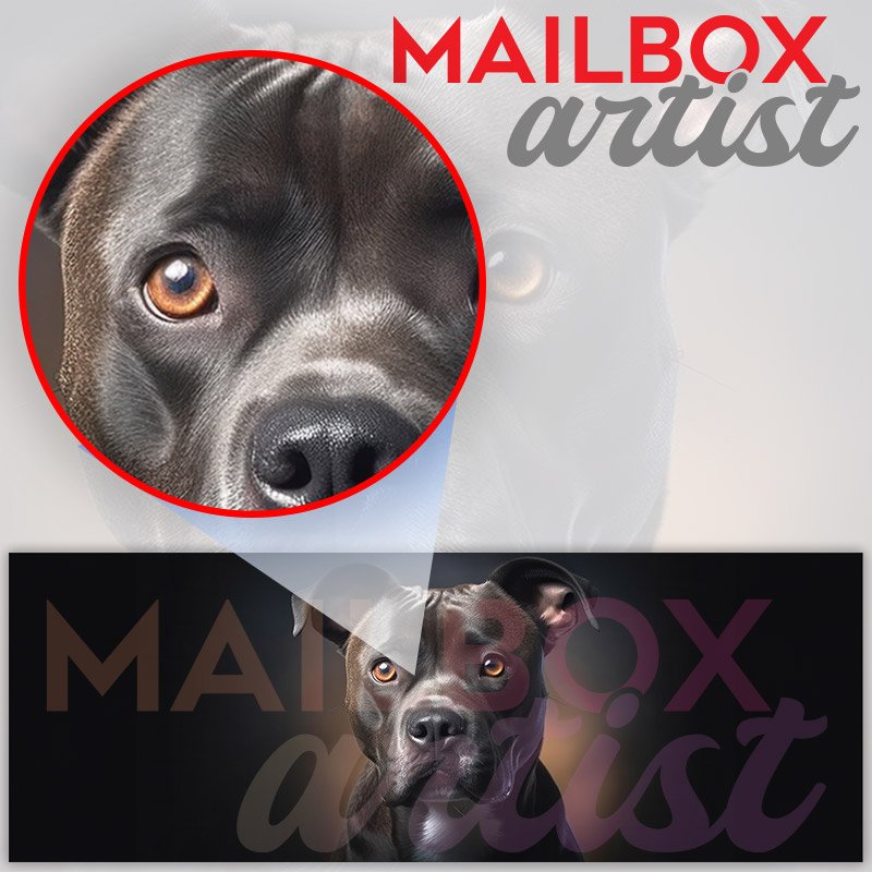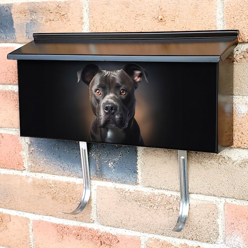 Applying your Portrait Of A Staffordshire Terrier Dog townhouse / ranch mailbox cover it’s pretty easy to convert your mailbox to a special and unique item. These covers require a flat surface, so they work with townhouse / ranch mailboxes that do not have any embossed decoration or signs. Magnetic mailbox covers work with steel boxes, for aluminum and plastic boxes we offer the self-adhesive vinyl covers. In case your mailbox doesn’t work with these covers, you can purchase the preinstalled cover on a brand new mailbox as well. Also, you can create your custom townhouse / ranch mailbox cover using you own pictures, adding your name, street number, etc.