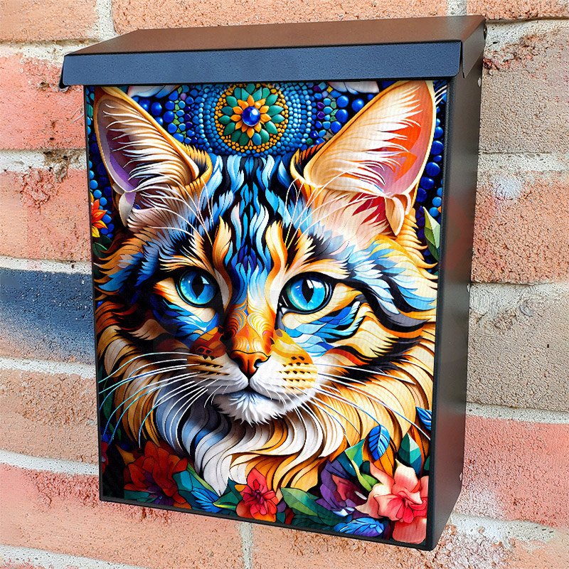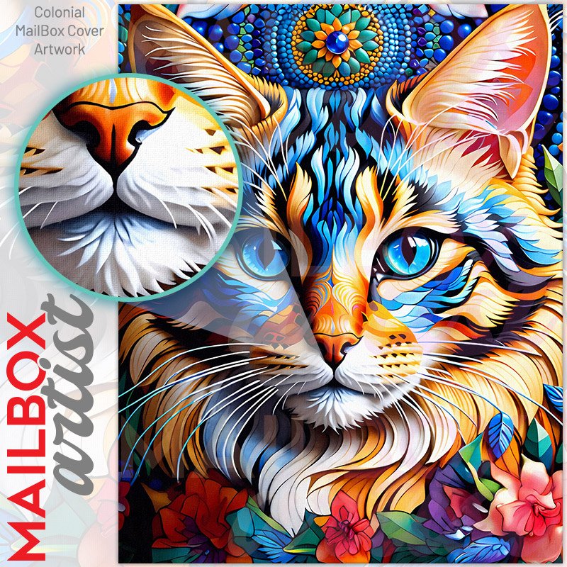 With this Pretty Bohemian Cat colonial mailbox cover it’s pretty easy to convert your mailbox to a special and unique item. These covers require a flat surface, so they work with colonial mailboxes that do not have any embossed decoration or signs. Magnetic mailbox covers work with steel colonial boxes only, while self-adhesive vinyl covers are available for aluminum, plastic and steel boxes. We also offer both self-adhesive and magnetic covers with regular opaque white vinyl or reflective vinyl, which works similarly to license plates or road signs. The reflective option makes the entire cover’s surface reflective, ensuring visibility at night. In case your mailbox doesn’t work with these covers, you can purchase the preinstalled cover on a brand new mailbox as well. Also, you can create your custom colonial mailbox cover using you own pictures, adding your name, street number, etc.