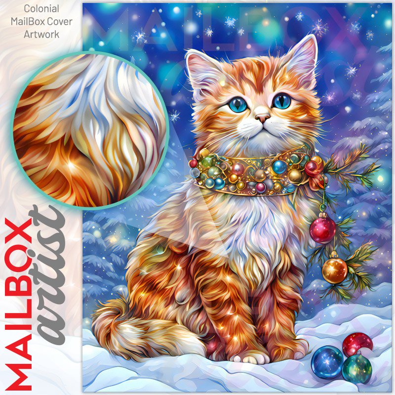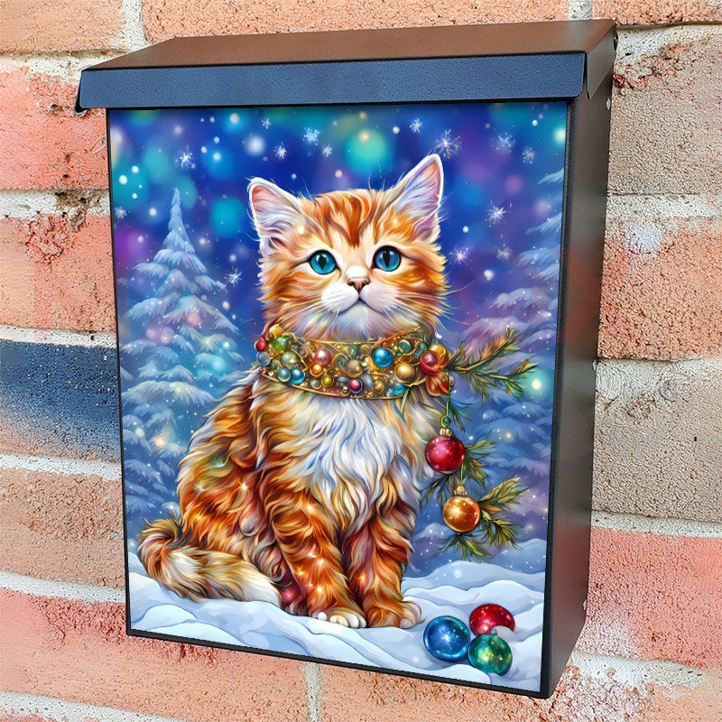 With this Pretty Christmas Kitten in the Snow colonial mailbox cover it’s pretty easy to convert your mailbox to a special and unique item. These covers require a flat surface, so they work with colonial mailboxes that do not have any embossed decoration or signs. Magnetic mailbox covers work with steel colonial boxes only, while self-adhesive vinyl covers are available for aluminum, plastic and steel boxes. We also offer both self-adhesive and magnetic covers with regular opaque white vinyl or reflective vinyl, which works similarly to license plates or road signs. The reflective option makes the entire cover’s surface reflective, ensuring visibility at night. In case your mailbox doesn’t work with these covers, you can purchase the preinstalled cover on a brand new mailbox as well. Also, you can create your custom colonial mailbox cover using you own pictures, adding your name, street number, etc.