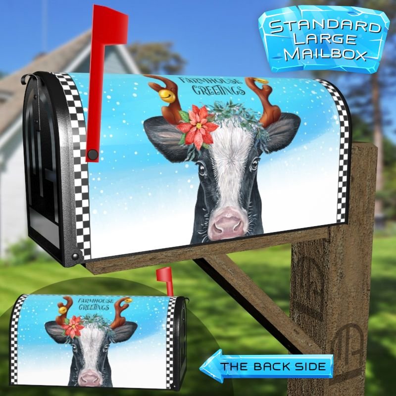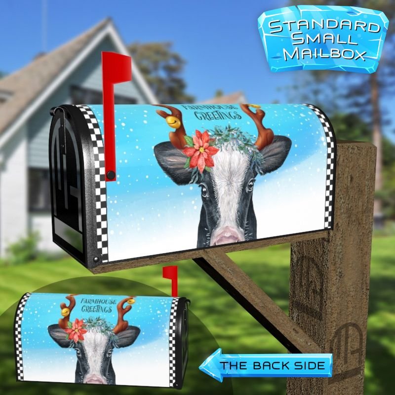 Dressing up your rural farm mailbox with the Pretty Farmhouse Christmas Cow mailbox cover is an easy way to convert it into a unique and special item. These covers require a smooth surface, so they are compatible with rural farm mailboxes that do not have any embossed decorations or signs. Magnetic mailbox covers work with steel boxes only, while self-adhesive vinyl covers are available for aluminum, plastic and steel boxes. If your mailbox is not compatible with these covers, you can purchase a brand new mailbox with a preinstalled cover. Additionally, you have the option to create a custom rural farm mailbox cover with your own pictures, name, street number, etc.