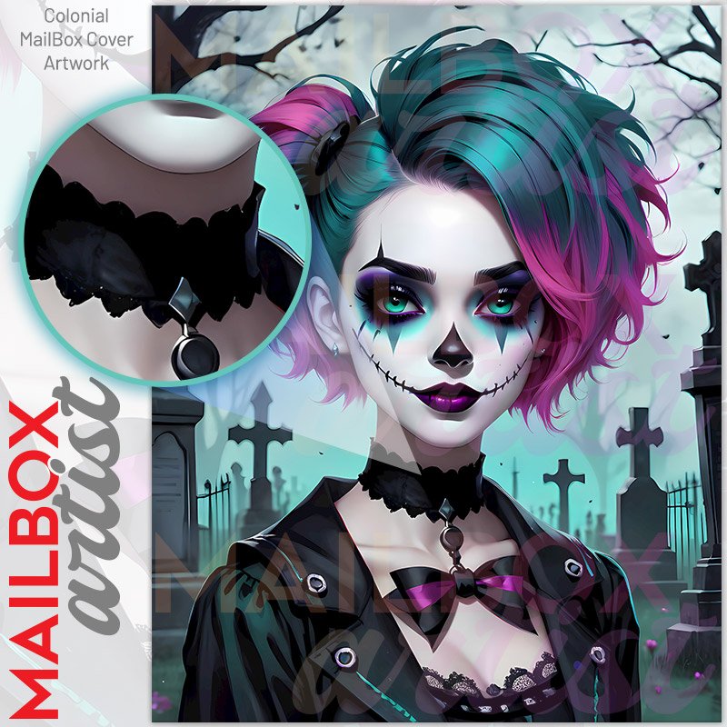 With this Pretty Halloween Girl in the Graveyard colonial mailbox cover it’s pretty easy to convert your mailbox to a special and unique item. These covers require a flat surface, so they work with colonial mailboxes that do not have any embossed decoration or signs. Magnetic mailbox covers work with steel colonial boxes only, while self-adhesive vinyl covers are available for aluminum, plastic and steel boxes. We also offer both self-adhesive and magnetic covers with regular opaque white vinyl or reflective vinyl, which works similarly to license plates or road signs. The reflective option makes the entire cover’s surface reflective, ensuring visibility at night. In case your mailbox doesn’t work with these covers, you can purchase the preinstalled cover on a brand new mailbox as well. Also, you can create your custom colonial mailbox cover using you own pictures, adding your name, street number, etc.