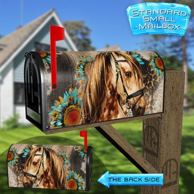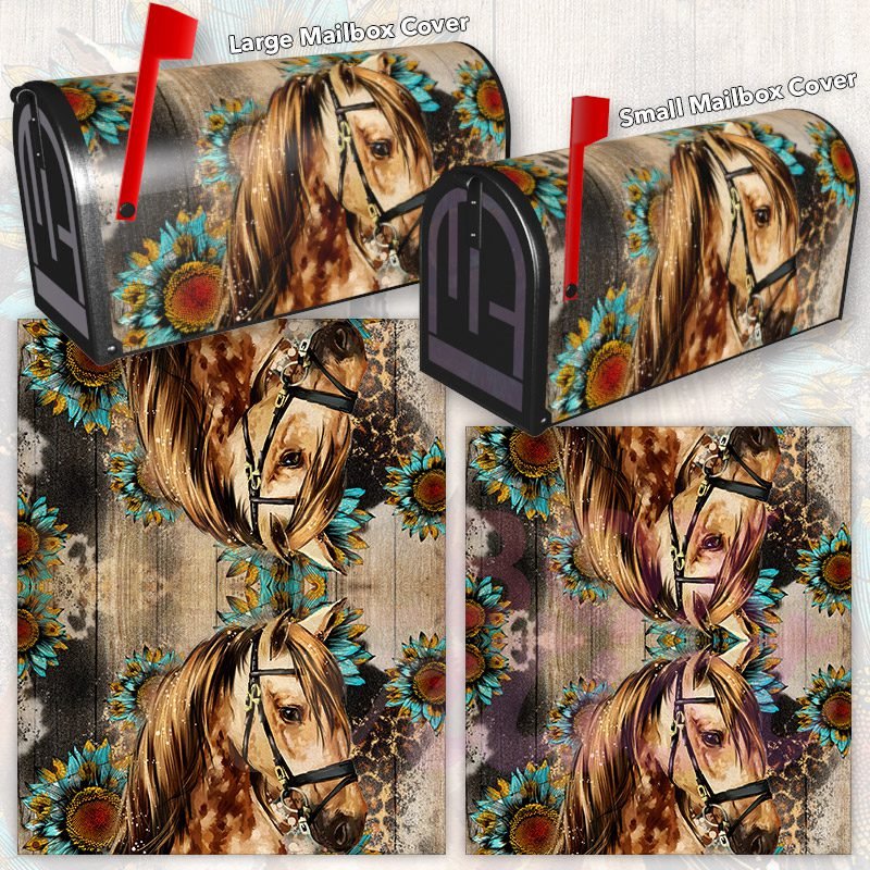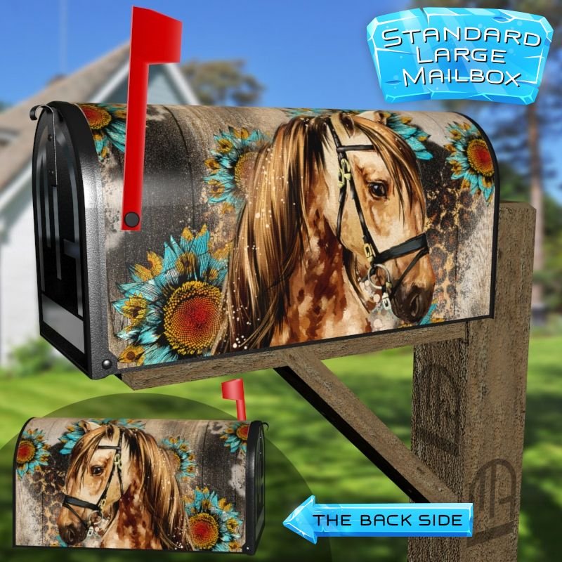Dressing up your rural farm mailbox with the Pretty Horse and Sunflowers mailbox cover is an easy way to convert it into a unique and special item. These covers require a smooth surface, so they are compatible with rural farm mailboxes that do not have any embossed decorations or signs. Magnetic mailbox covers work with steel boxes only, while self-adhesive vinyl covers are available for aluminum, plastic and steel boxes. If your mailbox is not compatible with these covers, you can purchase a brand new mailbox with a preinstalled cover. Additionally, you have the option to create a custom rural farm mailbox cover with your own pictures, name, street number, etc.