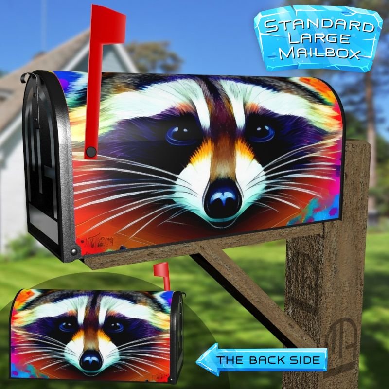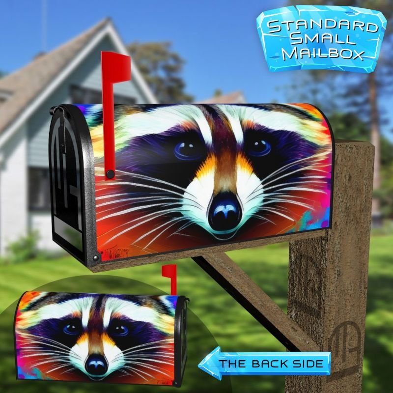 Dressing up your rural farm mailbox with the Pretty Rainbow Raccoon mailbox cover is an easy way to convert it into a unique and special item. These covers require a smooth surface, so they are compatible with rural farm mailboxes that do not have any embossed decorations or signs. Magnetic mailbox covers work with steel boxes only, while self-adhesive vinyl covers are available for aluminum, plastic and steel boxes. If your mailbox is not compatible with these covers, you can purchase a brand new mailbox with a preinstalled cover. Additionally, you have the option to create a custom rural farm mailbox cover with your own pictures, name, street number, etc.