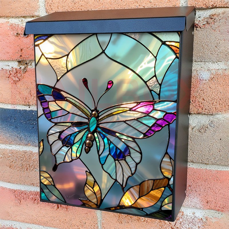 With this Pretty Stained Glass Butterfly colonial mailbox cover it’s pretty easy to convert your mailbox to a special and unique item. These covers require a flat surface, so they work with colonial mailboxes that do not have any embossed decoration or signs. Magnetic mailbox covers work with steel colonial boxes only, while self-adhesive vinyl covers are available for aluminum, plastic and steel boxes. We also offer both self-adhesive and magnetic covers with regular opaque white vinyl or reflective vinyl, which works similarly to license plates or road signs. The reflective option makes the entire cover’s surface reflective, ensuring visibility at night. In case your mailbox doesn’t work with these covers, you can purchase the preinstalled cover on a brand new mailbox as well. Also, you can create your custom colonial mailbox cover using you own pictures, adding your name, street number, etc.
