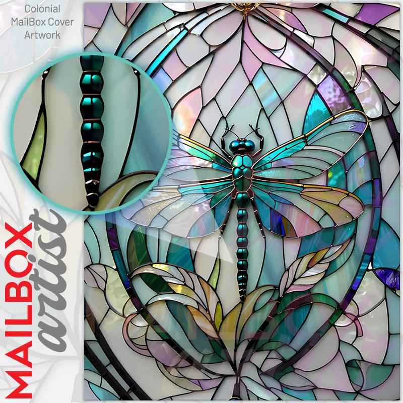 With this Pretty Stained Glass Dragonfly colonial mailbox cover it’s pretty easy to convert your mailbox to a special and unique item. These covers require a flat surface, so they work with colonial mailboxes that do not have any embossed decoration or signs. Magnetic mailbox covers work with steel colonial boxes only, while self-adhesive vinyl covers are available for aluminum, plastic and steel boxes. We also offer both self-adhesive and magnetic covers with regular opaque white vinyl or reflective vinyl, which works similarly to license plates or road signs. The reflective option makes the entire cover’s surface reflective, ensuring visibility at night. In case your mailbox doesn’t work with these covers, you can purchase the preinstalled cover on a brand new mailbox as well. Also, you can create your custom colonial mailbox cover using you own pictures, adding your name, street number, etc.
