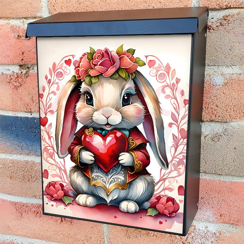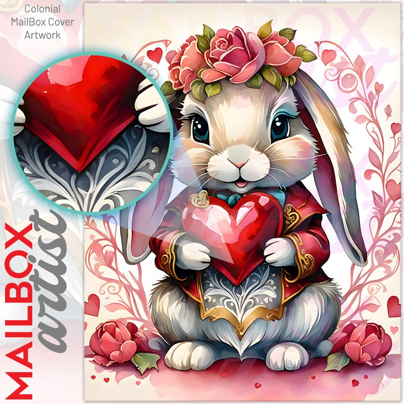 With this Pretty Valentine’s Bunny colonial mailbox cover it’s pretty easy to convert your mailbox to a special and unique item. These covers require a flat surface, so they work with colonial mailboxes that do not have any embossed decoration or signs. Magnetic mailbox covers work with steel colonial boxes only, while self-adhesive vinyl covers are available for aluminum, plastic and steel boxes. We also offer both self-adhesive and magnetic covers with regular opaque white vinyl or reflective vinyl, which works similarly to license plates or road signs. The reflective option makes the entire cover’s surface reflective, ensuring visibility at night. In case your mailbox doesn’t work with these covers, you can purchase the preinstalled cover on a brand new mailbox as well. Also, you can create your custom colonial mailbox cover using you own pictures, adding your name, street number, etc.
