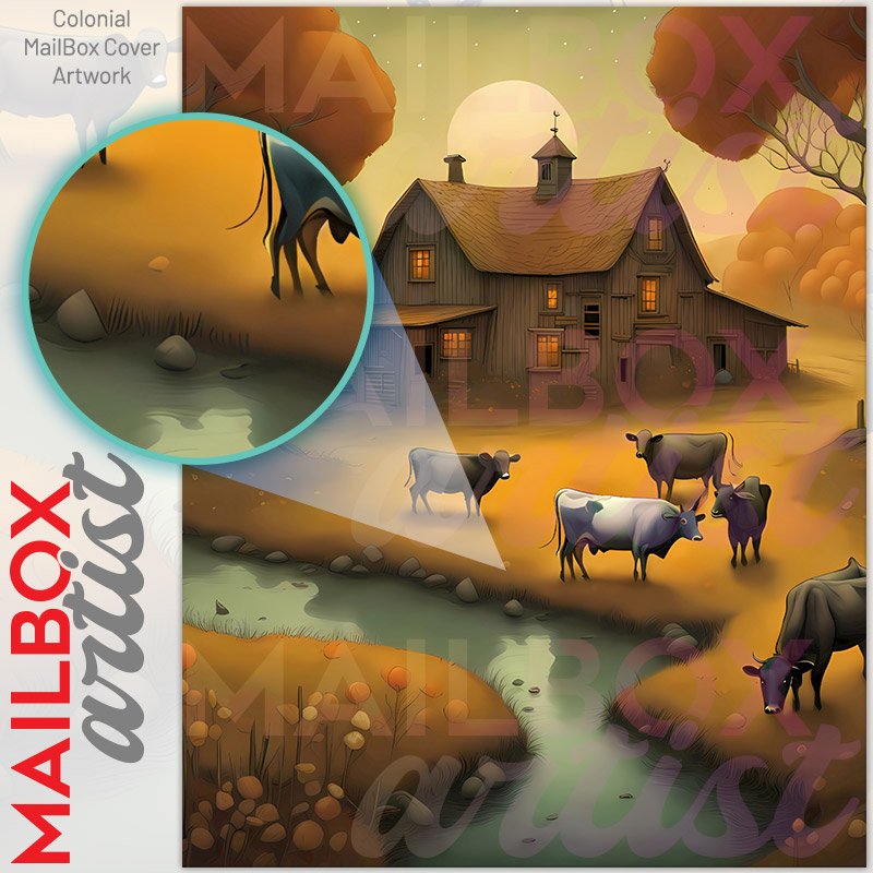 With this Prim Country Farmhouse with Cows colonial mailbox cover it’s pretty easy to convert your mailbox to a special and unique item. These covers require a flat surface, so they work with colonial mailboxes that do not have any embossed decoration or signs. Magnetic mailbox covers work with steel colonial boxes only, while self-adhesive vinyl covers are available for aluminum, plastic and steel boxes. We also offer both self-adhesive and magnetic covers with regular opaque white vinyl or reflective vinyl, which works similarly to license plates or road signs. The reflective option makes the entire cover’s surface reflective, ensuring visibility at night. In case your mailbox doesn’t work with these covers, you can purchase the preinstalled cover on a brand new mailbox as well. Also, you can create your custom colonial mailbox cover using you own pictures, adding your name, street number, etc.