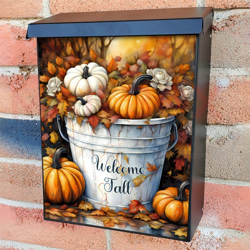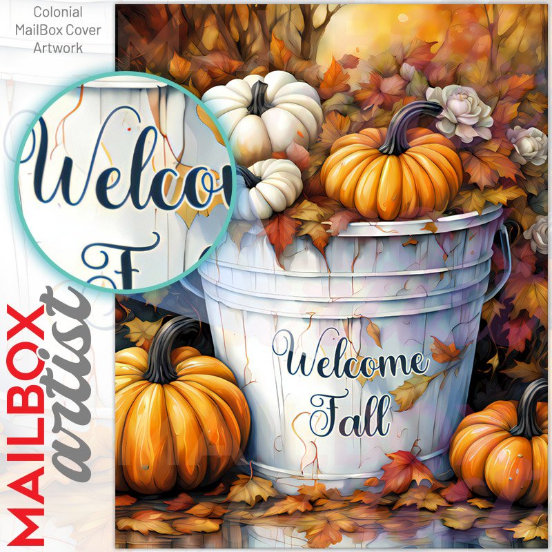 With this Pumpkin Bucket with Greeting colonial mailbox cover it’s pretty easy to convert your mailbox to a special and unique item. These covers require a flat surface, so they work with colonial mailboxes that do not have any embossed decoration or signs. Magnetic mailbox covers work with steel colonial boxes only, while self-adhesive vinyl covers are available for aluminum, plastic and steel boxes. We also offer both self-adhesive and magnetic covers with regular opaque white vinyl or reflective vinyl, which works similarly to license plates or road signs. The reflective option makes the entire cover’s surface reflective, ensuring visibility at night. In case your mailbox doesn’t work with these covers, you can purchase the preinstalled cover on a brand new mailbox as well. Also, you can create your custom colonial mailbox cover using you own pictures, adding your name, street number, etc.