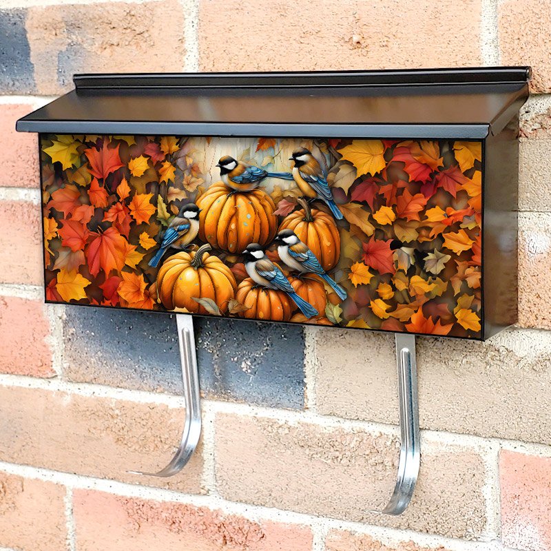Applying your Pumpkin Chickadees and Leaves townhouse / ranch mailbox cover it’s pretty easy to convert your mailbox to a special and unique item. These covers require a flat surface, so they work with townhouse / ranch mailboxes that do not have any embossed decoration or signs. Magnetic mailbox covers work with steel boxes, for aluminum and plastic boxes we offer the self-adhesive vinyl covers. In case your mailbox doesn’t work with these covers, you can purchase the preinstalled cover on a brand new mailbox as well. Also, you can create your custom townhouse / ranch mailbox cover using you own pictures, adding your name, street number, etc.