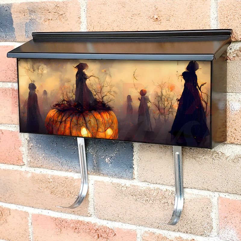 Applying your Pumpkin Field Witches townhouse / ranch mailbox cover it’s pretty easy to convert your mailbox to a special and unique item. These covers require a flat surface, so they work with townhouse / ranch mailboxes that do not have any embossed decoration or signs. Magnetic mailbox covers work with steel boxes, for aluminum and plastic boxes we offer the self-adhesive vinyl covers. In case your mailbox doesn’t work with these covers, you can purchase the preinstalled cover on a brand new mailbox as well. Also, you can create your custom townhouse / ranch mailbox cover using you own pictures, adding your name, street number, etc.