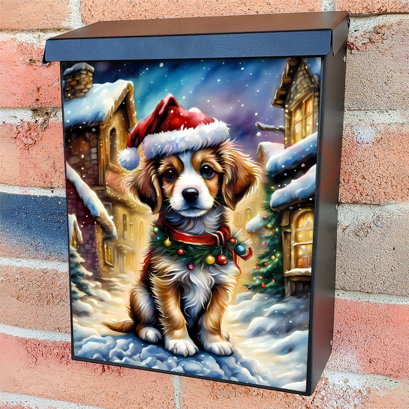 With this Puppy in Santa Hat colonial mailbox cover it’s pretty easy to convert your mailbox to a special and unique item. These covers require a flat surface, so they work with colonial mailboxes that do not have any embossed decoration or signs. Magnetic mailbox covers work with steel colonial boxes only, while self-adhesive vinyl covers are available for aluminum, plastic and steel boxes. We also offer both self-adhesive and magnetic covers with regular opaque white vinyl or reflective vinyl, which works similarly to license plates or road signs. The reflective option makes the entire cover’s surface reflective, ensuring visibility at night. In case your mailbox doesn’t work with these covers, you can purchase the preinstalled cover on a brand new mailbox as well. Also, you can create your custom colonial mailbox cover using you own pictures, adding your name, street number, etc.