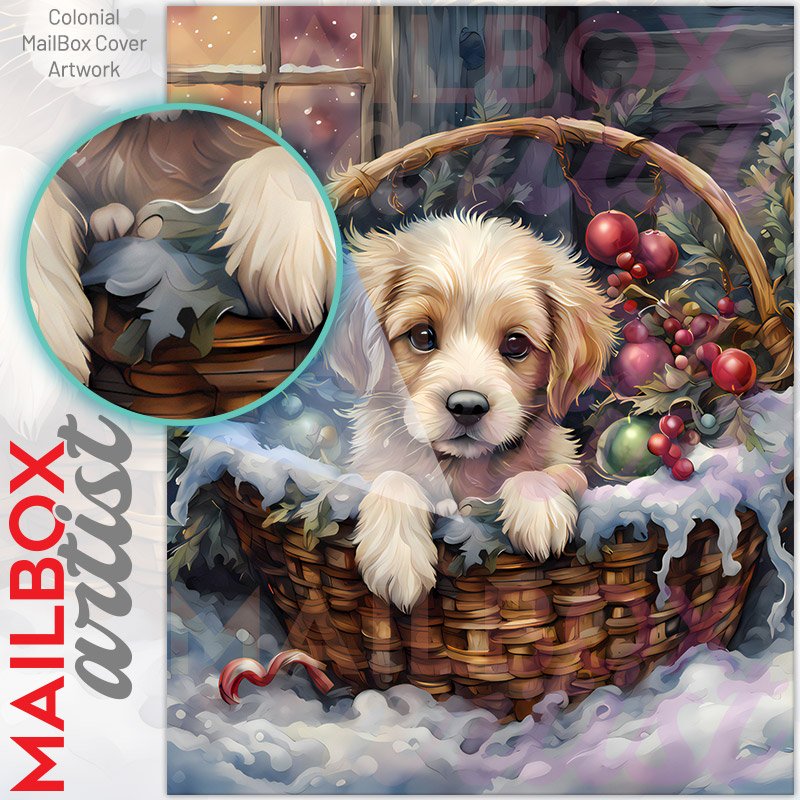 With this Puppy in the Christmas Basket colonial mailbox cover it’s pretty easy to convert your mailbox to a special and unique item. These covers require a flat surface, so they work with colonial mailboxes that do not have any embossed decoration or signs. Magnetic mailbox covers work with steel colonial boxes only, while self-adhesive vinyl covers are available for aluminum, plastic and steel boxes. We also offer both self-adhesive and magnetic covers with regular opaque white vinyl or reflective vinyl, which works similarly to license plates or road signs. The reflective option makes the entire cover’s surface reflective, ensuring visibility at night. In case your mailbox doesn’t work with these covers, you can purchase the preinstalled cover on a brand new mailbox as well. Also, you can create your custom colonial mailbox cover using you own pictures, adding your name, street number, etc.