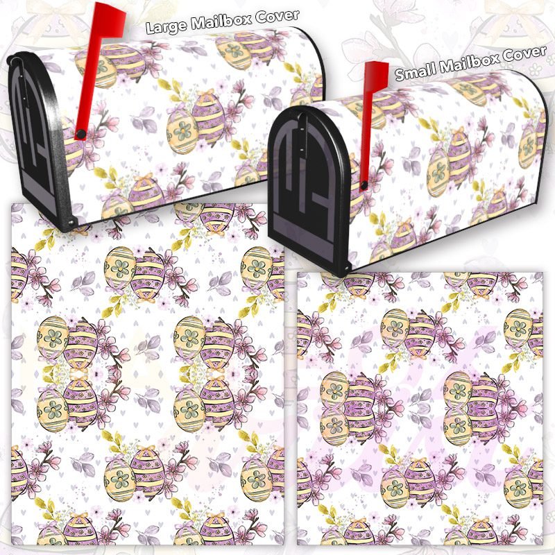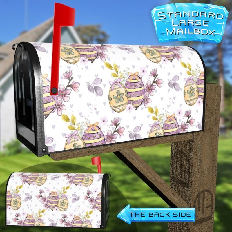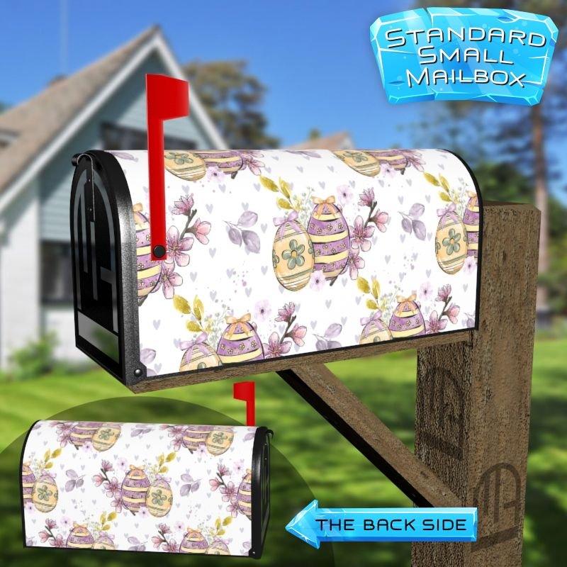Dressing up your rural farm mailbox with the Purple and Yellow Easter Eggs mailbox cover is an easy way to convert it into a unique and special item. These covers require a smooth surface, so they are compatible with rural farm mailboxes that do not have any embossed decorations or signs. Magnetic mailbox covers work with steel boxes only, while self-adhesive vinyl covers are available for aluminum, plastic and steel boxes. If your mailbox is not compatible with these covers, you can purchase a brand new mailbox with a preinstalled cover. Additionally, you have the option to create a custom rural farm mailbox cover with your own pictures, name, street number, etc.