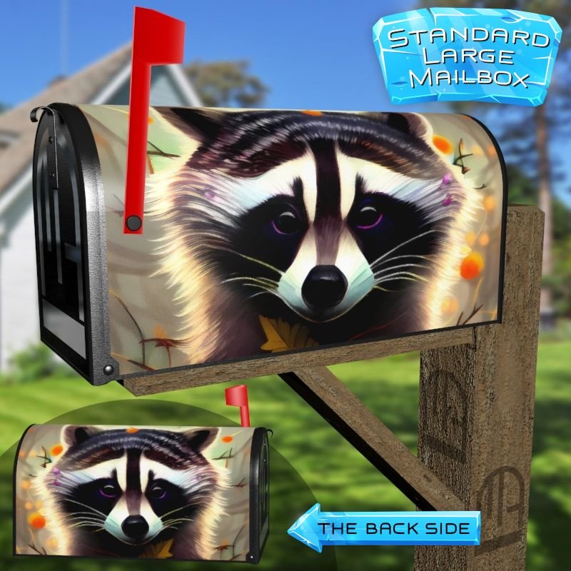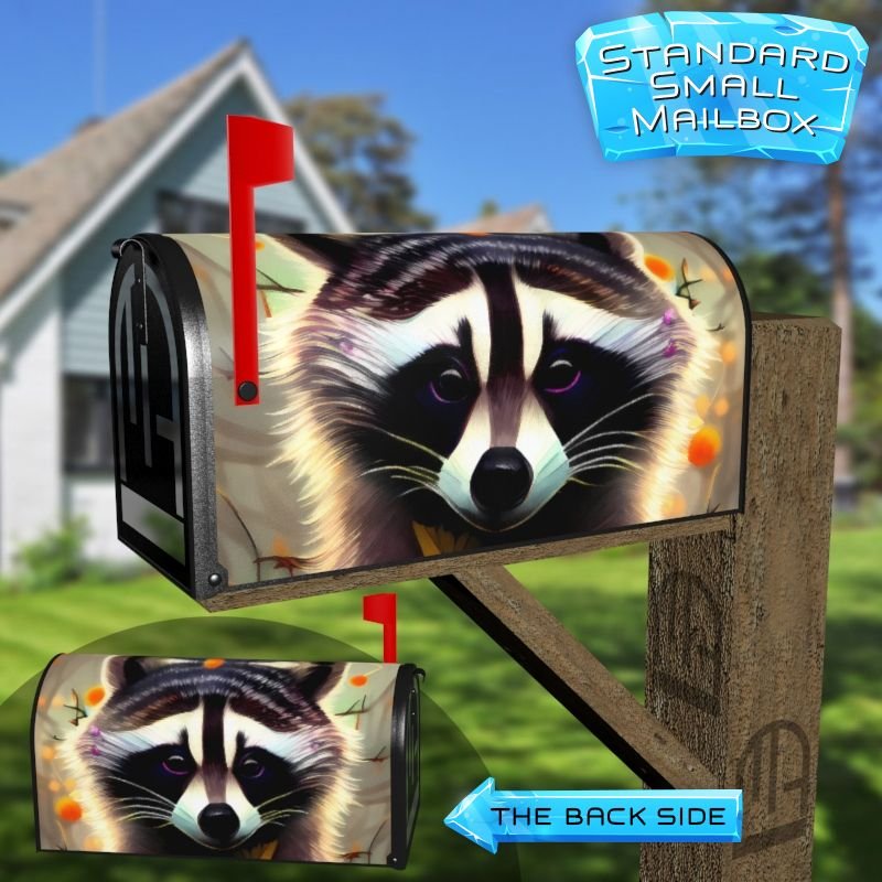 Dressing up your rural farm mailbox with the Raccoon with Flowers #3 mailbox cover is an easy way to convert it into a unique and special item. These covers require a smooth surface, so they are compatible with rural farm mailboxes that do not have any embossed decorations or signs. Magnetic mailbox covers work with steel boxes only, while self-adhesive vinyl covers are available for aluminum, plastic and steel boxes. If your mailbox is not compatible with these covers, you can purchase a brand new mailbox with a preinstalled cover. Additionally, you have the option to create a custom rural farm mailbox cover with your own pictures, name, street number, etc.