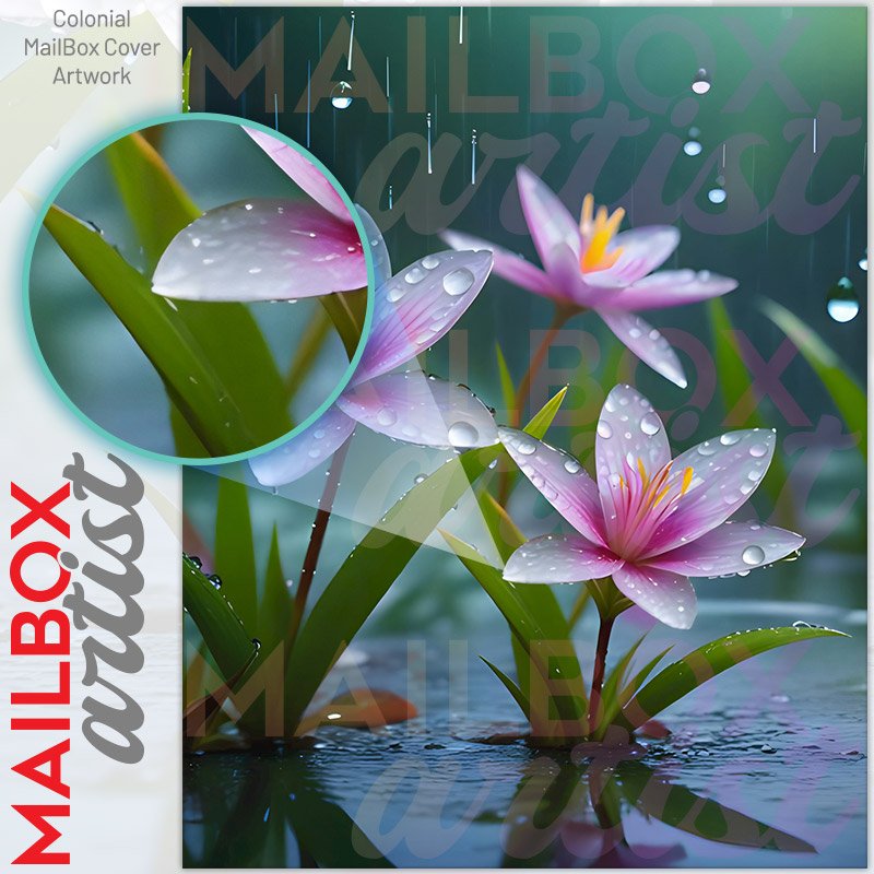 With this Raindrops Falling on the Flowers colonial mailbox cover it’s pretty easy to convert your mailbox to a special and unique item. These covers require a flat surface, so they work with colonial mailboxes that do not have any embossed decoration or signs. Magnetic mailbox covers work with steel colonial boxes only, while self-adhesive vinyl covers are available for aluminum, plastic and steel boxes. We also offer both self-adhesive and magnetic covers with regular opaque white vinyl or reflective vinyl, which works similarly to license plates or road signs. The reflective option makes the entire cover’s surface reflective, ensuring visibility at night. In case your mailbox doesn’t work with these covers, you can purchase the preinstalled cover on a brand new mailbox as well. Also, you can create your custom colonial mailbox cover using you own pictures, adding your name, street number, etc.
