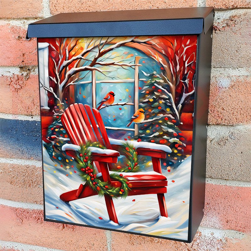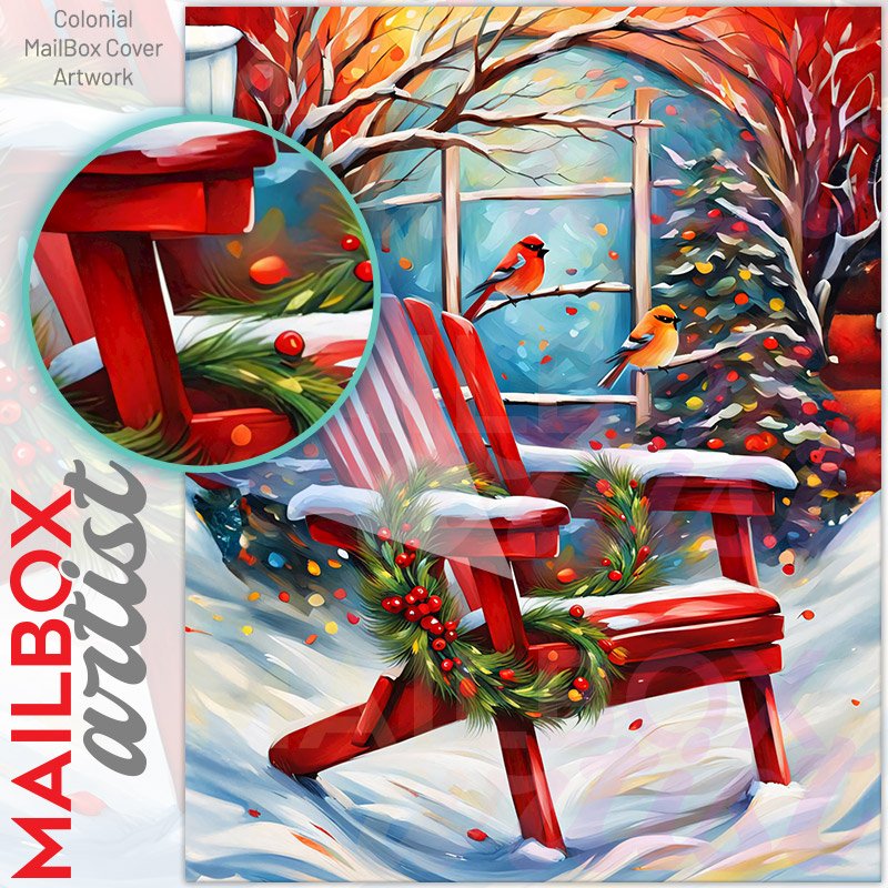 With this Red Chair at the Christmas Cottage colonial mailbox cover it’s pretty easy to convert your mailbox to a special and unique item. These covers require a flat surface, so they work with colonial mailboxes that do not have any embossed decoration or signs. Magnetic mailbox covers work with steel colonial boxes only, while self-adhesive vinyl covers are available for aluminum, plastic and steel boxes. We also offer both self-adhesive and magnetic covers with regular opaque white vinyl or reflective vinyl, which works similarly to license plates or road signs. The reflective option makes the entire cover’s surface reflective, ensuring visibility at night. In case your mailbox doesn’t work with these covers, you can purchase the preinstalled cover on a brand new mailbox as well. Also, you can create your custom colonial mailbox cover using you own pictures, adding your name, street number, etc.