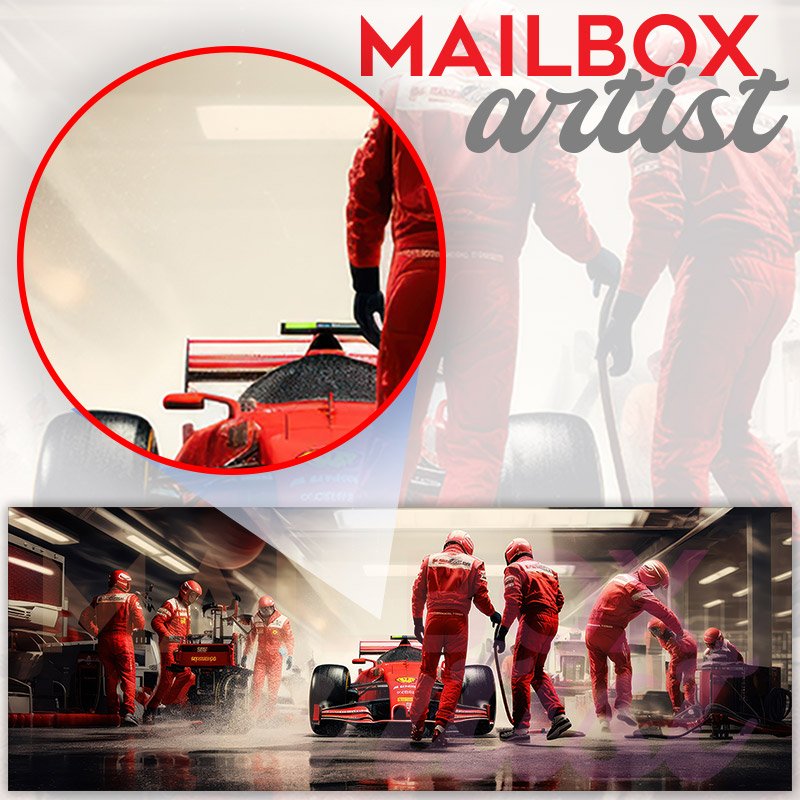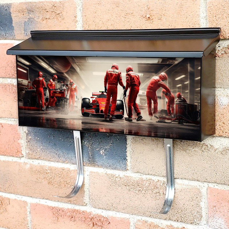Applying your Red Formula Car At Tire Change townhouse / ranch mailbox cover it’s pretty easy to convert your mailbox to a special and unique item. These covers require a flat surface, so they work with townhouse / ranch mailboxes that do not have any embossed decoration or signs. Magnetic mailbox covers work with steel boxes, for aluminum and plastic boxes we offer the self-adhesive vinyl covers. In case your mailbox doesn’t work with these covers, you can purchase the preinstalled cover on a brand new mailbox as well. Also, you can create your custom townhouse / ranch mailbox cover using you own pictures, adding your name, street number, etc.