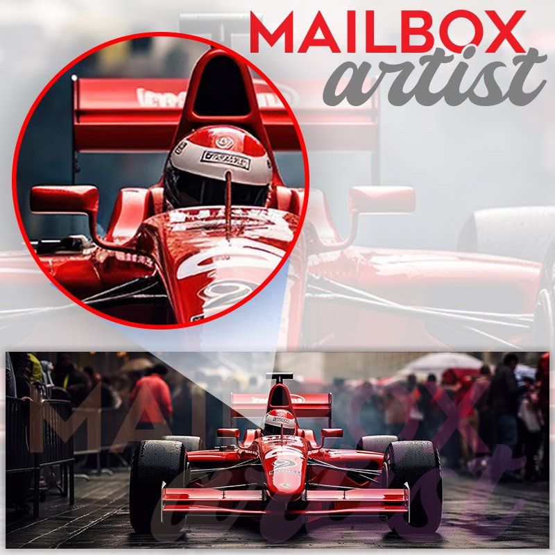 This Red Formula Car On A Street mailbox design was created by Krisztina Soos