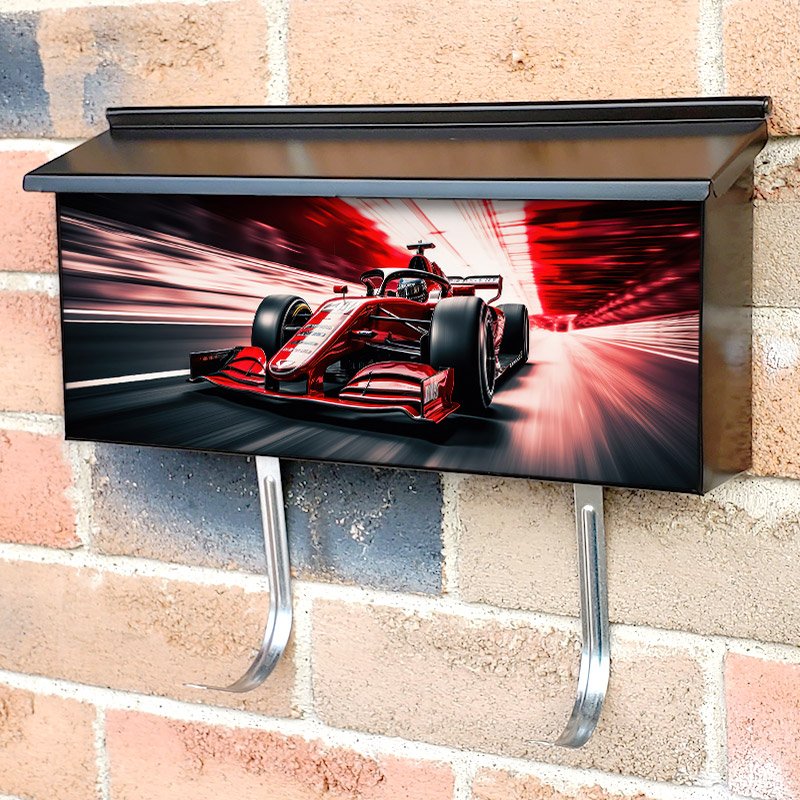Applying your Red Formula Car Racing townhouse / ranch mailbox cover it’s pretty easy to convert your mailbox to a special and unique item. These covers require a flat surface, so they work with townhouse / ranch mailboxes that do not have any embossed decoration or signs. Magnetic mailbox covers work with steel boxes, for aluminum and plastic boxes we offer the self-adhesive vinyl covers. In case your mailbox doesn’t work with these covers, you can purchase the preinstalled cover on a brand new mailbox as well. Also, you can create your custom townhouse / ranch mailbox cover using you own pictures, adding your name, street number, etc.