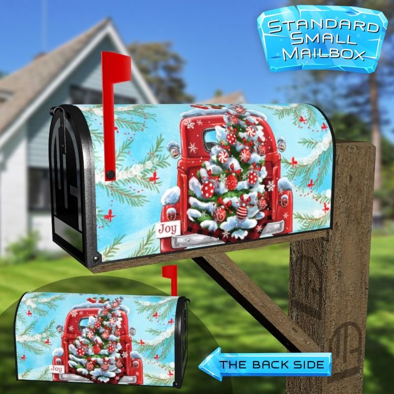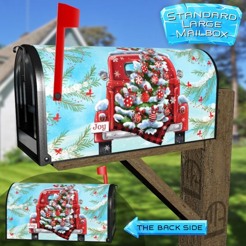 Dressing up your rural farm mailbox with the Red Truck and a Christmas Tree mailbox cover is an easy way to convert it into a unique and special item. These covers require a smooth surface, so they are compatible with rural farm mailboxes that do not have any embossed decorations or signs. Magnetic mailbox covers work with steel boxes only, while self-adhesive vinyl covers are available for aluminum, plastic and steel boxes. If your mailbox is not compatible with these covers, you can purchase a brand new mailbox with a preinstalled cover. Additionally, you have the option to create a custom rural farm mailbox cover with your own pictures, name, street number, etc.