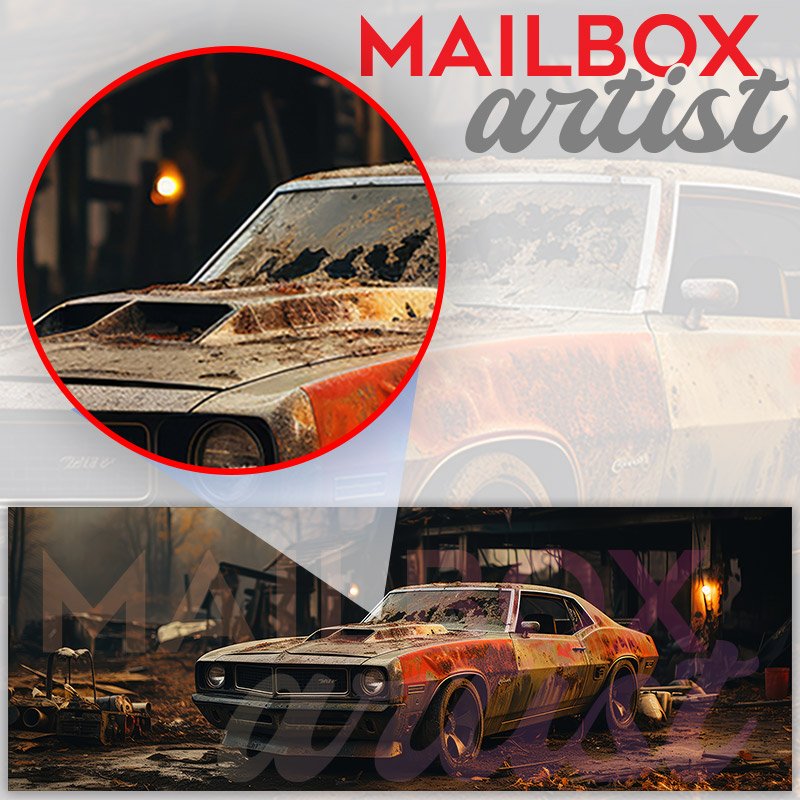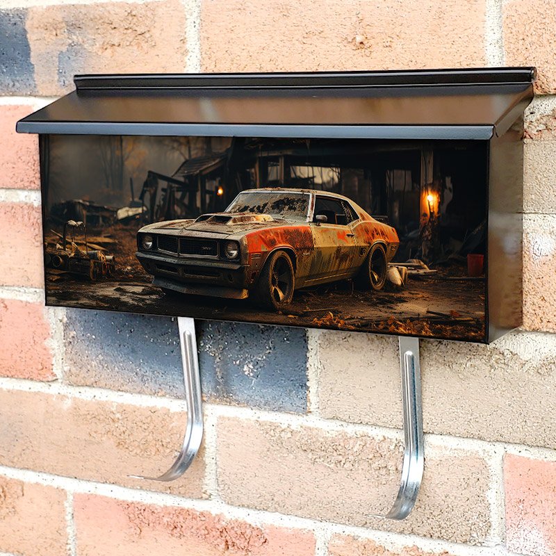Applying your Retro Rusty Car Body Scene 11 townhouse / ranch mailbox cover it’s pretty easy to convert your mailbox to a special and unique item. These covers require a flat surface, so they work with townhouse / ranch mailboxes that do not have any embossed decoration or signs. Magnetic mailbox covers work with steel boxes, for aluminum and plastic boxes we offer the self-adhesive vinyl covers. In case your mailbox doesn’t work with these covers, you can purchase the preinstalled cover on a brand new mailbox as well. Also, you can create your custom townhouse / ranch mailbox cover using you own pictures, adding your name, street number, etc.