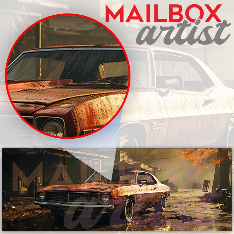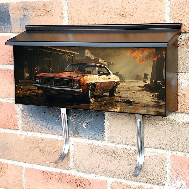 Applying your Retro Rusty Car Body Scene 3 townhouse / ranch mailbox cover it’s pretty easy to convert your mailbox to a special and unique item. These covers require a flat surface, so they work with townhouse / ranch mailboxes that do not have any embossed decoration or signs. Magnetic mailbox covers work with steel boxes, for aluminum and plastic boxes we offer the self-adhesive vinyl covers. In case your mailbox doesn’t work with these covers, you can purchase the preinstalled cover on a brand new mailbox as well. Also, you can create your custom townhouse / ranch mailbox cover using you own pictures, adding your name, street number, etc.