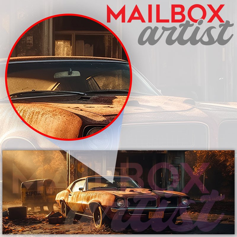Applying your Retro Rusty Car Body Scene 7 townhouse / ranch mailbox cover it’s pretty easy to convert your mailbox to a special and unique item. These covers require a flat surface, so they work with townhouse / ranch mailboxes that do not have any embossed decoration or signs. Magnetic mailbox covers work with steel boxes, for aluminum and plastic boxes we offer the self-adhesive vinyl covers. In case your mailbox doesn’t work with these covers, you can purchase the preinstalled cover on a brand new mailbox as well. Also, you can create your custom townhouse / ranch mailbox cover using you own pictures, adding your name, street number, etc.