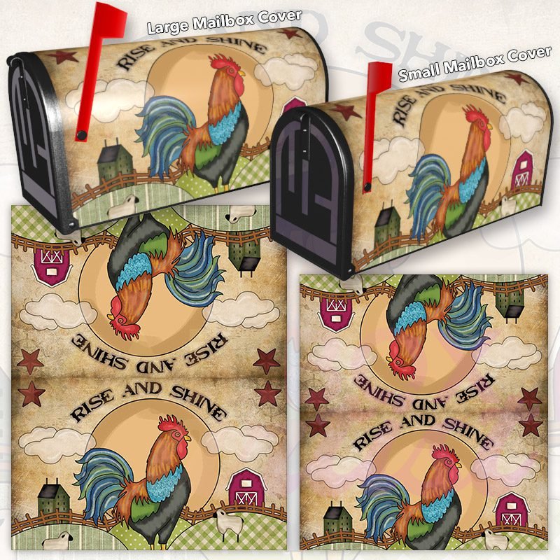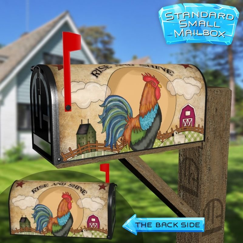 Dressing up your rural farm mailbox with the Rise and Shine Rooster mailbox cover is an easy way to convert it into a unique and special item. These covers require a smooth surface, so they are compatible with rural farm mailboxes that do not have any embossed decorations or signs. Magnetic mailbox covers work with steel boxes only, while self-adhesive vinyl covers are available for aluminum, plastic and steel boxes. If your mailbox is not compatible with these covers, you can purchase a brand new mailbox with a preinstalled cover. Additionally, you have the option to create a custom rural farm mailbox cover with your own pictures, name, street number, etc.