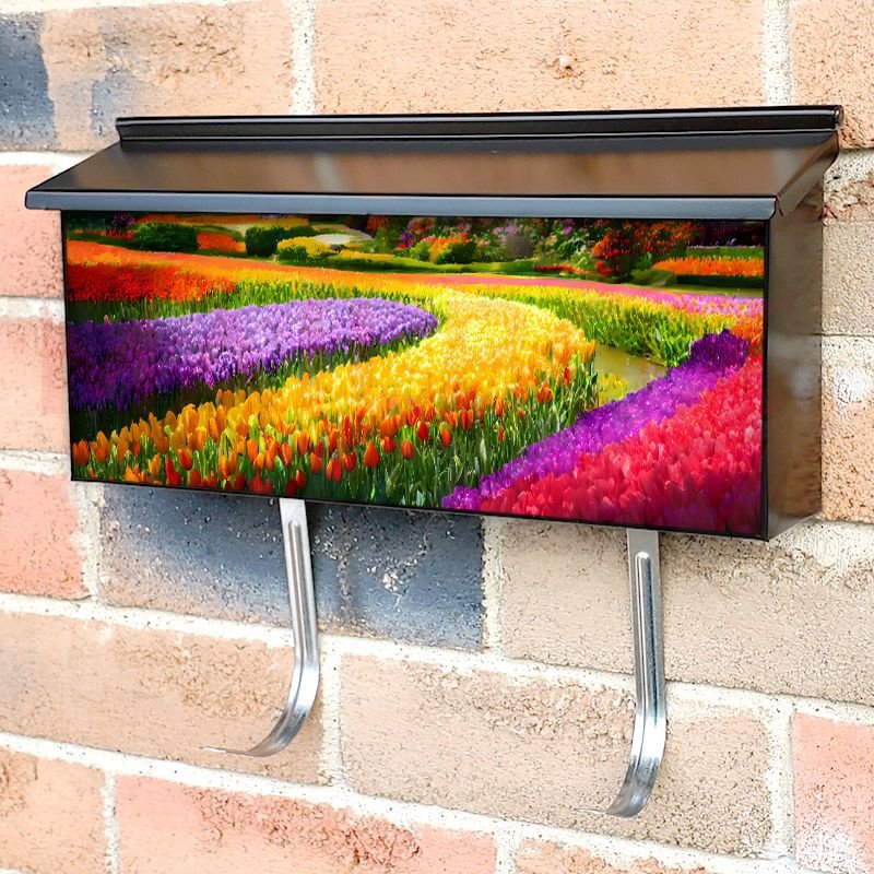 Applying your River with Tulips townhouse / ranch mailbox cover it’s pretty easy to convert your mailbox to a special and unique item. These covers require a flat surface, so they work with townhouse / ranch mailboxes that do not have any embossed decoration or signs. Magnetic mailbox covers work with steel boxes, for aluminum and plastic boxes we offer the self-adhesive vinyl covers. In case your mailbox doesn’t work with these covers, you can purchase the preinstalled cover on a brand new mailbox as well. Also, you can create your custom townhouse / ranch mailbox cover using you own pictures, adding your name, street number, etc.
