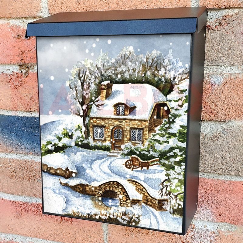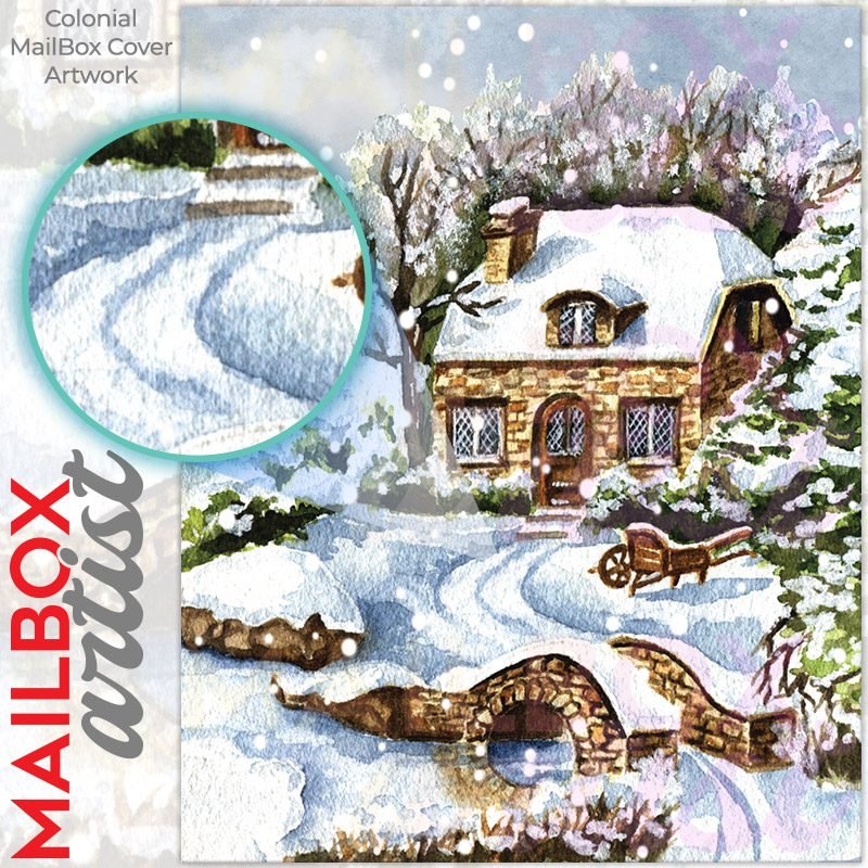 With this Riverside Cottage in the Winter colonial mailbox cover it’s pretty easy to convert your mailbox to a special and unique item. These covers require a flat surface, so they work with colonial mailboxes that do not have any embossed decoration or signs. Magnetic mailbox covers work with steel colonial boxes only, while self-adhesive vinyl covers are available for aluminum, plastic and steel boxes. We also offer both self-adhesive and magnetic covers with regular opaque white vinyl or reflective vinyl, which works similarly to license plates or road signs. The reflective option makes the entire cover’s surface reflective, ensuring visibility at night. In case your mailbox doesn’t work with these covers, you can purchase the preinstalled cover on a brand new mailbox as well. Also, you can create your custom colonial mailbox cover using you own pictures, adding your name, street number, etc.