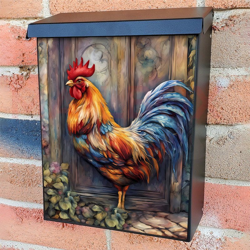 With this Rooster at the Door colonial mailbox cover it’s pretty easy to convert your mailbox to a special and unique item. These covers require a flat surface, so they work with colonial mailboxes that do not have any embossed decoration or signs. Magnetic mailbox covers work with steel colonial boxes only, while self-adhesive vinyl covers are available for aluminum, plastic and steel boxes. We also offer both self-adhesive and magnetic covers with regular opaque white vinyl or reflective vinyl, which works similarly to license plates or road signs. The reflective option makes the entire cover’s surface reflective, ensuring visibility at night. In case your mailbox doesn’t work with these covers, you can purchase the preinstalled cover on a brand new mailbox as well. Also, you can create your custom colonial mailbox cover using you own pictures, adding your name, street number, etc.
