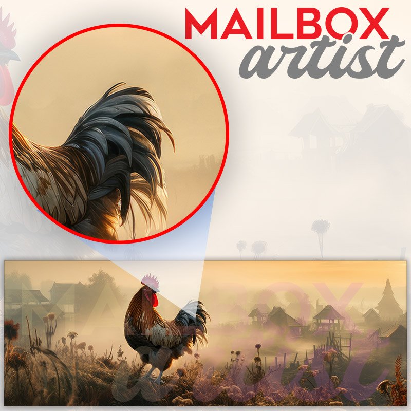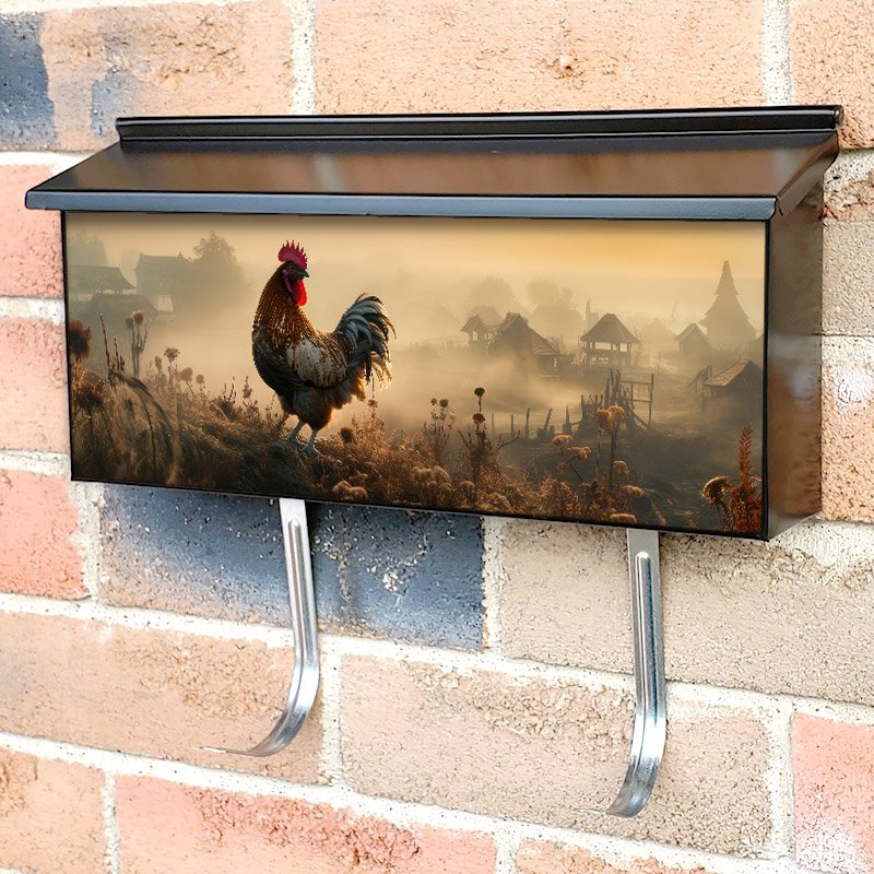 Applying your Rooster In Sunset Fog In The Village townhouse / ranch mailbox cover it’s pretty easy to convert your mailbox to a special and unique item. These covers require a flat surface, so they work with townhouse / ranch mailboxes that do not have any embossed decoration or signs. Magnetic mailbox covers work with steel boxes, for aluminum and plastic boxes we offer the self-adhesive vinyl covers. In case your mailbox doesn’t work with these covers, you can purchase the preinstalled cover on a brand new mailbox as well. Also, you can create your custom townhouse / ranch mailbox cover using you own pictures, adding your name, street number, etc.