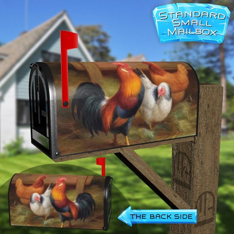 Dressing up your rural farm mailbox with the Rooster with Hens mailbox cover is an easy way to convert it into a unique and special item. These covers require a smooth surface, so they are compatible with rural farm mailboxes that do not have any embossed decorations or signs. Magnetic mailbox covers work with steel boxes only, while self-adhesive vinyl covers are available for aluminum, plastic and steel boxes. If your mailbox is not compatible with these covers, you can purchase a brand new mailbox with a preinstalled cover. Additionally, you have the option to create a custom rural farm mailbox cover with your own pictures, name, street number, etc.