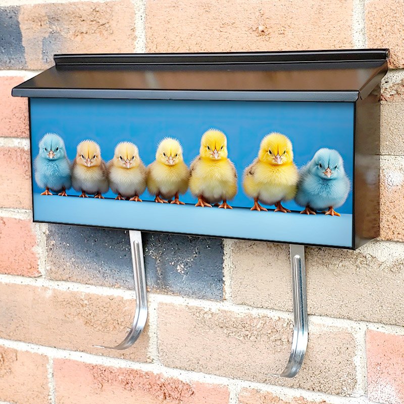Applying your Row Of Easter Chicks townhouse / ranch mailbox cover it’s pretty easy to convert your mailbox to a special and unique item. These covers require a flat surface, so they work with townhouse / ranch mailboxes that do not have any embossed decoration or signs. Magnetic mailbox covers work with steel boxes, for aluminum and plastic boxes we offer the self-adhesive vinyl covers. In case your mailbox doesn’t work with these covers, you can purchase the preinstalled cover on a brand new mailbox as well. Also, you can create your custom townhouse / ranch mailbox cover using you own pictures, adding your name, street number, etc.