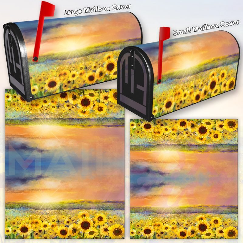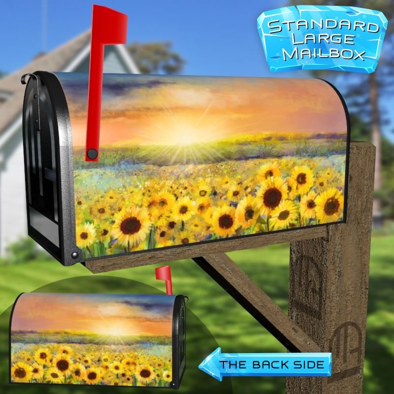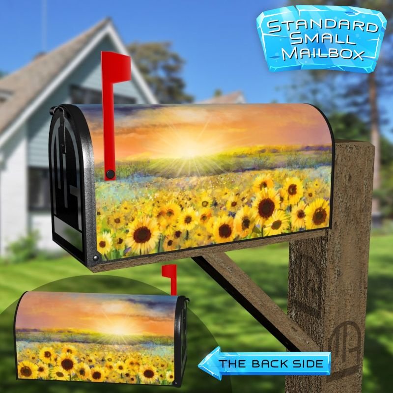 Dressing up your rural farm mailbox with the Rural Sunflower Field mailbox cover is an easy way to convert it into a unique and special item. These covers require a smooth surface, so they are compatible with rural farm mailboxes that do not have any embossed decorations or signs. Magnetic mailbox covers work with steel boxes only, while self-adhesive vinyl covers are available for aluminum, plastic and steel boxes. If your mailbox is not compatible with these covers, you can purchase a brand new mailbox with a preinstalled cover. Additionally, you have the option to create a custom rural farm mailbox cover with your own pictures, name, street number, etc.