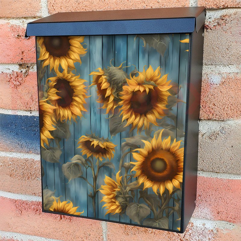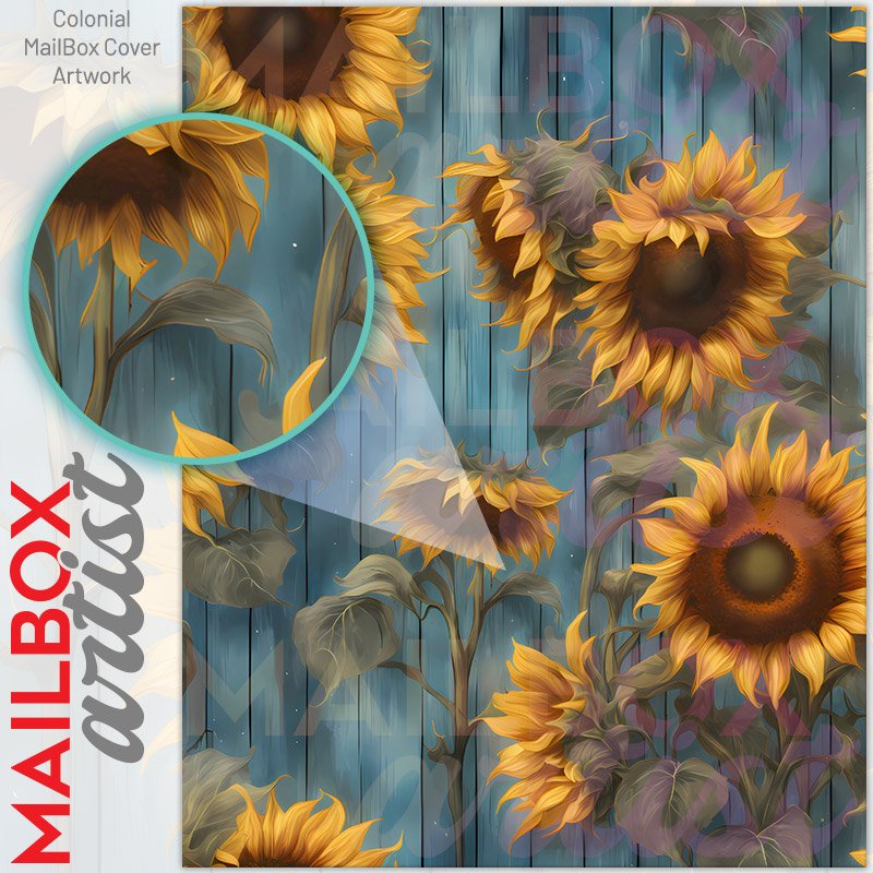 With this Rustic Farmhouse Sunflowers colonial mailbox cover it’s pretty easy to convert your mailbox to a special and unique item. These covers require a flat surface, so they work with colonial mailboxes that do not have any embossed decoration or signs. Magnetic mailbox covers work with steel colonial boxes only, while self-adhesive vinyl covers are available for aluminum, plastic and steel boxes. We also offer both self-adhesive and magnetic covers with regular opaque white vinyl or reflective vinyl, which works similarly to license plates or road signs. The reflective option makes the entire cover’s surface reflective, ensuring visibility at night. In case your mailbox doesn’t work with these covers, you can purchase the preinstalled cover on a brand new mailbox as well. Also, you can create your custom colonial mailbox cover using you own pictures, adding your name, street number, etc.