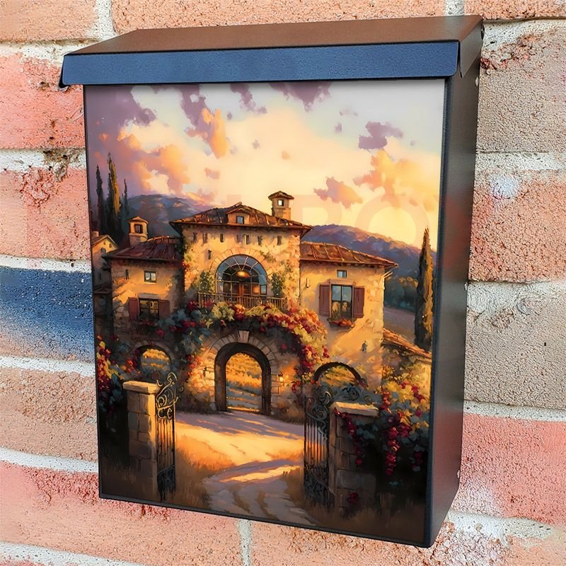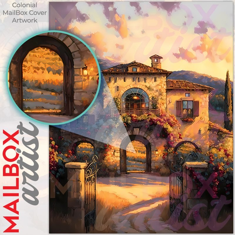 With this Rustic Villa in Tuscany #8 colonial mailbox cover it’s pretty easy to convert your mailbox to a special and unique item. These covers require a flat surface, so they work with colonial mailboxes that do not have any embossed decoration or signs. Magnetic mailbox covers work with steel colonial boxes only, while self-adhesive vinyl covers are available for aluminum, plastic and steel boxes. We also offer both self-adhesive and magnetic covers with regular opaque white vinyl or reflective vinyl, which works similarly to license plates or road signs. The reflective option makes the entire cover’s surface reflective, ensuring visibility at night. In case your mailbox doesn’t work with these covers, you can purchase the preinstalled cover on a brand new mailbox as well. Also, you can create your custom colonial mailbox cover using you own pictures, adding your name, street number, etc.