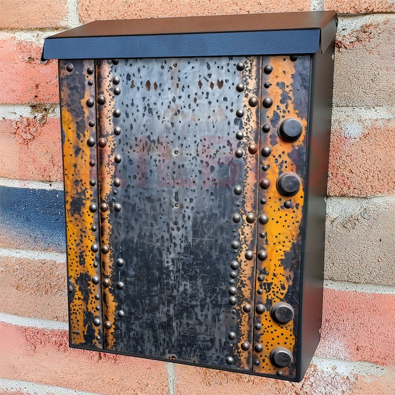 This Rusty Teal and Yellow Metal mailbox design was created by Krisztina Soos