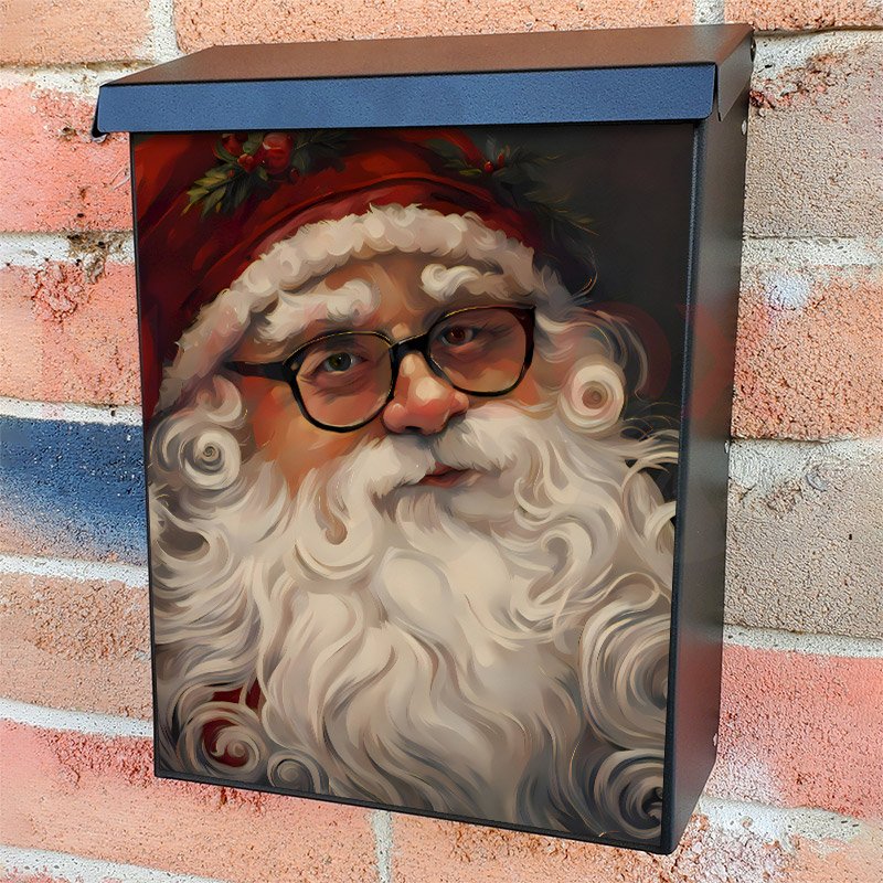 With this Santa Claus in Eyeglasses colonial mailbox cover it’s pretty easy to convert your mailbox to a special and unique item. These covers require a flat surface, so they work with colonial mailboxes that do not have any embossed decoration or signs. Magnetic mailbox covers work with steel colonial boxes only, while self-adhesive vinyl covers are available for aluminum, plastic and steel boxes. We also offer both self-adhesive and magnetic covers with regular opaque white vinyl or reflective vinyl, which works similarly to license plates or road signs. The reflective option makes the entire cover’s surface reflective, ensuring visibility at night. In case your mailbox doesn’t work with these covers, you can purchase the preinstalled cover on a brand new mailbox as well. Also, you can create your custom colonial mailbox cover using you own pictures, adding your name, street number, etc.