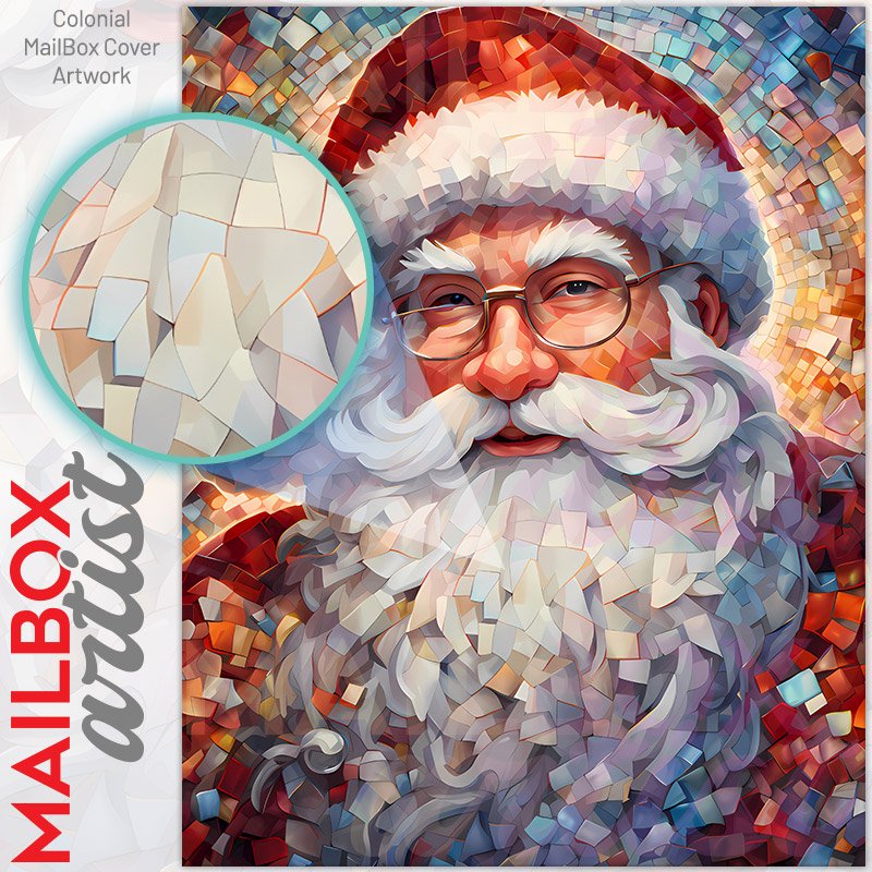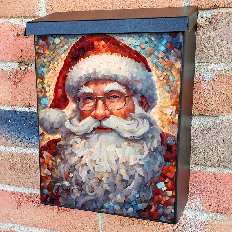 With this Santa Claus Mosaic Portrait colonial mailbox cover it’s pretty easy to convert your mailbox to a special and unique item. These covers require a flat surface, so they work with colonial mailboxes that do not have any embossed decoration or signs. Magnetic mailbox covers work with steel colonial boxes only, while self-adhesive vinyl covers are available for aluminum, plastic and steel boxes. We also offer both self-adhesive and magnetic covers with regular opaque white vinyl or reflective vinyl, which works similarly to license plates or road signs. The reflective option makes the entire cover’s surface reflective, ensuring visibility at night. In case your mailbox doesn’t work with these covers, you can purchase the preinstalled cover on a brand new mailbox as well. Also, you can create your custom colonial mailbox cover using you own pictures, adding your name, street number, etc.