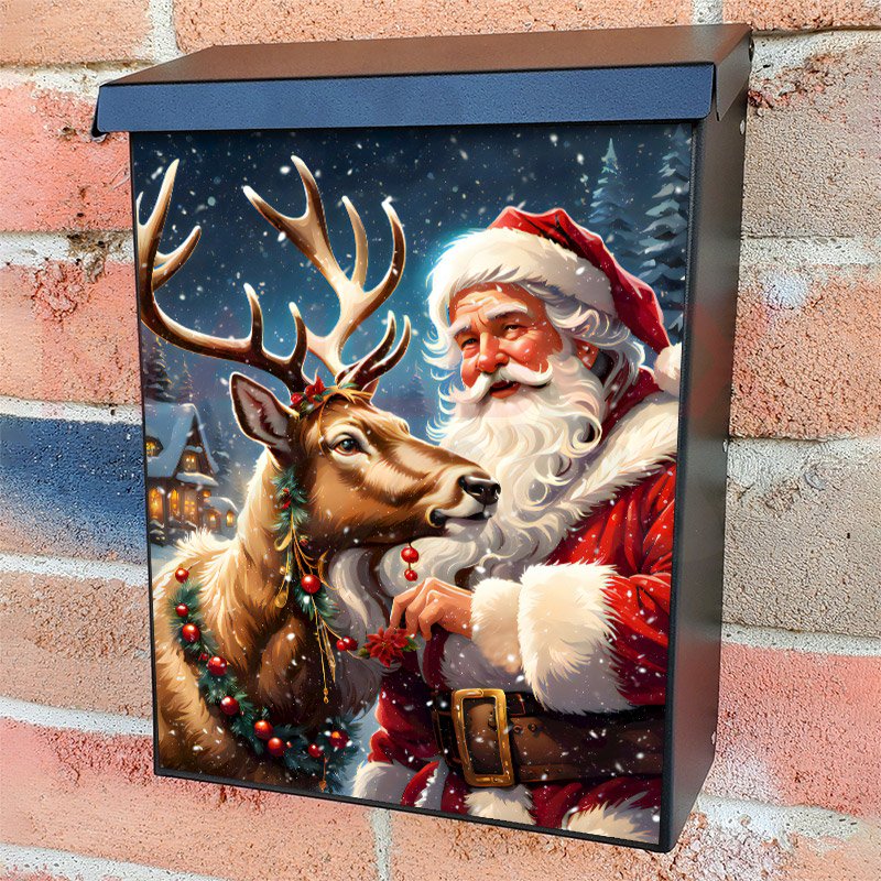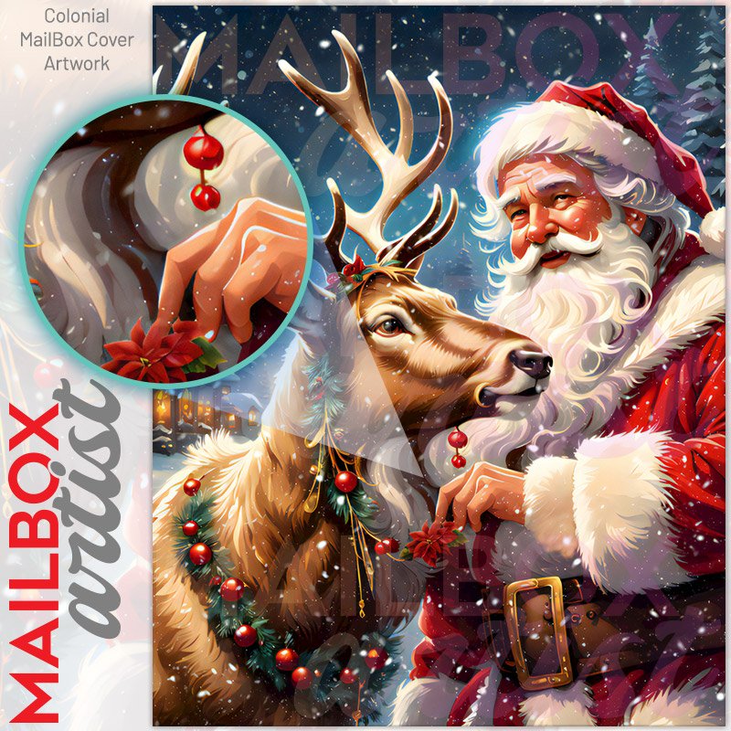 With this Santa Claus with Rudolph colonial mailbox cover it’s pretty easy to convert your mailbox to a special and unique item. These covers require a flat surface, so they work with colonial mailboxes that do not have any embossed decoration or signs. Magnetic mailbox covers work with steel colonial boxes only, while self-adhesive vinyl covers are available for aluminum, plastic and steel boxes. We also offer both self-adhesive and magnetic covers with regular opaque white vinyl or reflective vinyl, which works similarly to license plates or road signs. The reflective option makes the entire cover’s surface reflective, ensuring visibility at night. In case your mailbox doesn’t work with these covers, you can purchase the preinstalled cover on a brand new mailbox as well. Also, you can create your custom colonial mailbox cover using you own pictures, adding your name, street number, etc.