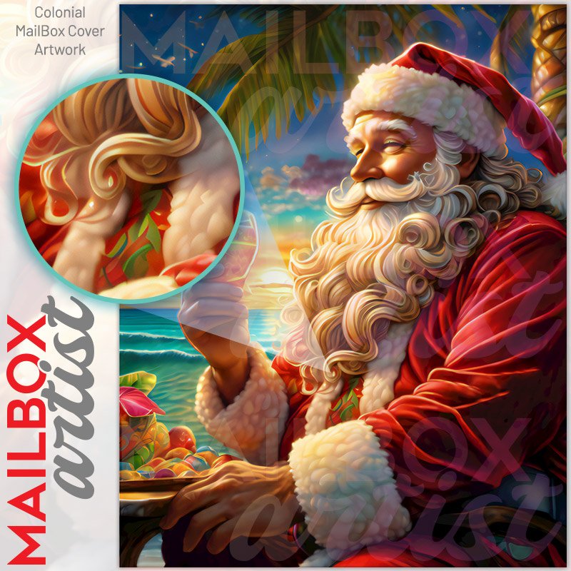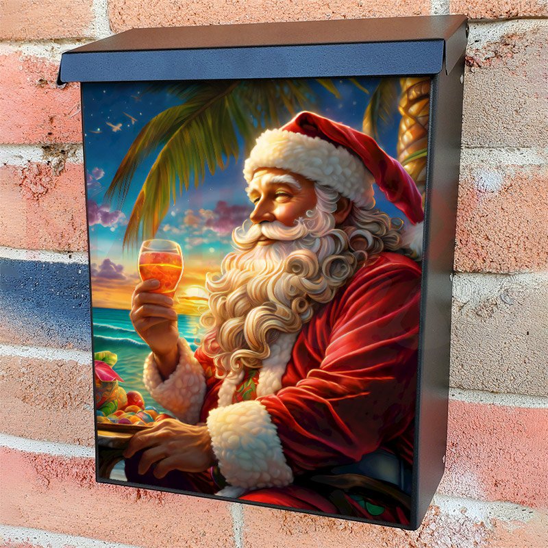 With this Santa’s Summer Holiday colonial mailbox cover it’s pretty easy to convert your mailbox to a special and unique item. These covers require a flat surface, so they work with colonial mailboxes that do not have any embossed decoration or signs. Magnetic mailbox covers work with steel colonial boxes only, while self-adhesive vinyl covers are available for aluminum, plastic and steel boxes. We also offer both self-adhesive and magnetic covers with regular opaque white vinyl or reflective vinyl, which works similarly to license plates or road signs. The reflective option makes the entire cover’s surface reflective, ensuring visibility at night. In case your mailbox doesn’t work with these covers, you can purchase the preinstalled cover on a brand new mailbox as well. Also, you can create your custom colonial mailbox cover using you own pictures, adding your name, street number, etc.
