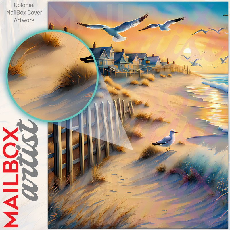 With this Seagulls on the Dunes colonial mailbox cover it’s pretty easy to convert your mailbox to a special and unique item. These covers require a flat surface, so they work with colonial mailboxes that do not have any embossed decoration or signs. Magnetic mailbox covers work with steel colonial boxes only, while self-adhesive vinyl covers are available for aluminum, plastic and steel boxes. We also offer both self-adhesive and magnetic covers with regular opaque white vinyl or reflective vinyl, which works similarly to license plates or road signs. The reflective option makes the entire cover’s surface reflective, ensuring visibility at night. In case your mailbox doesn’t work with these covers, you can purchase the preinstalled cover on a brand new mailbox as well. Also, you can create your custom colonial mailbox cover using you own pictures, adding your name, street number, etc.