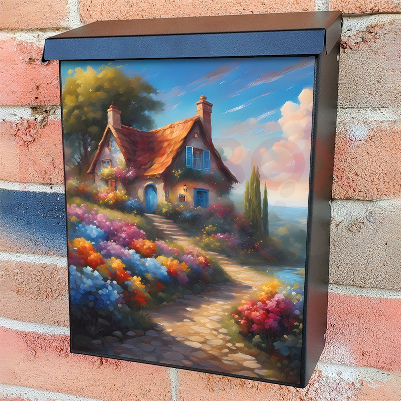 With this Seaside Cottage and Flowers colonial mailbox cover it’s pretty easy to convert your mailbox to a special and unique item. These covers require a flat surface, so they work with colonial mailboxes that do not have any embossed decoration or signs. Magnetic mailbox covers work with steel colonial boxes only, while self-adhesive vinyl covers are available for aluminum, plastic and steel boxes. We also offer both self-adhesive and magnetic covers with regular opaque white vinyl or reflective vinyl, which works similarly to license plates or road signs. The reflective option makes the entire cover’s surface reflective, ensuring visibility at night. In case your mailbox doesn’t work with these covers, you can purchase the preinstalled cover on a brand new mailbox as well. Also, you can create your custom colonial mailbox cover using you own pictures, adding your name, street number, etc.