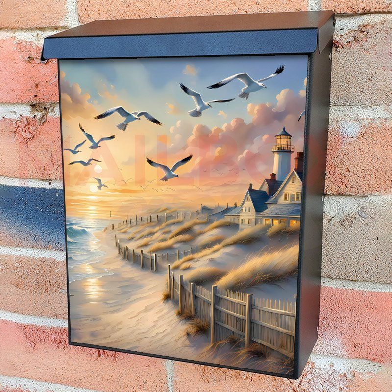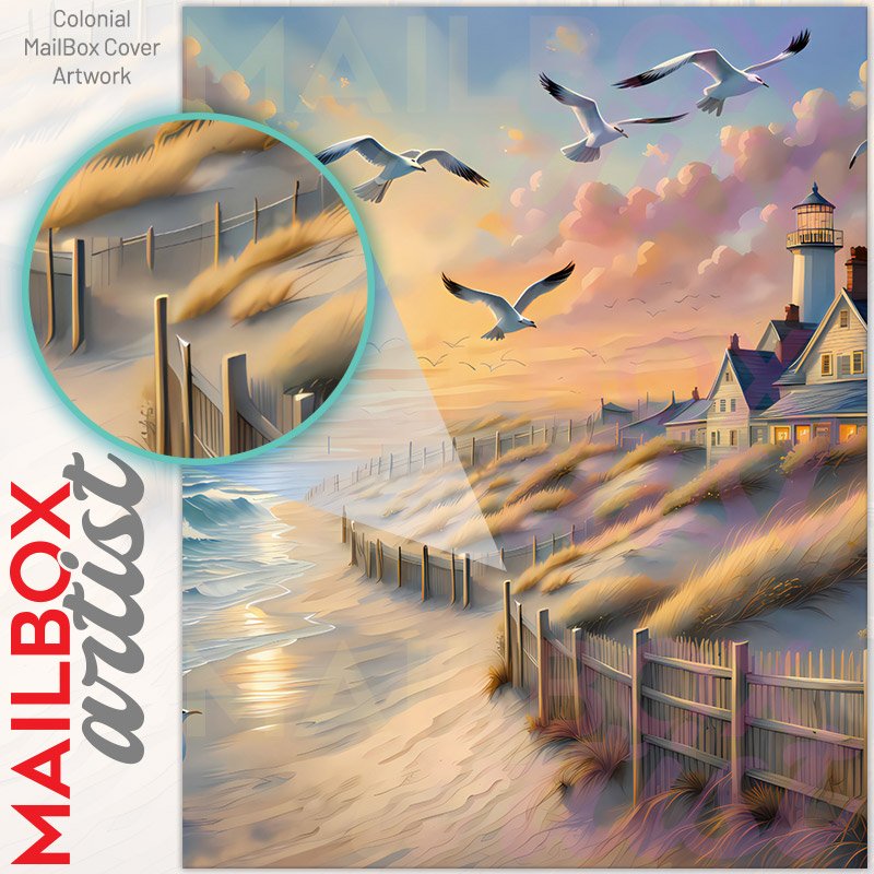 With this Seaside Cottages and Seagulls colonial mailbox cover it’s pretty easy to convert your mailbox to a special and unique item. These covers require a flat surface, so they work with colonial mailboxes that do not have any embossed decoration or signs. Magnetic mailbox covers work with steel colonial boxes only, while self-adhesive vinyl covers are available for aluminum, plastic and steel boxes. We also offer both self-adhesive and magnetic covers with regular opaque white vinyl or reflective vinyl, which works similarly to license plates or road signs. The reflective option makes the entire cover’s surface reflective, ensuring visibility at night. In case your mailbox doesn’t work with these covers, you can purchase the preinstalled cover on a brand new mailbox as well. Also, you can create your custom colonial mailbox cover using you own pictures, adding your name, street number, etc.