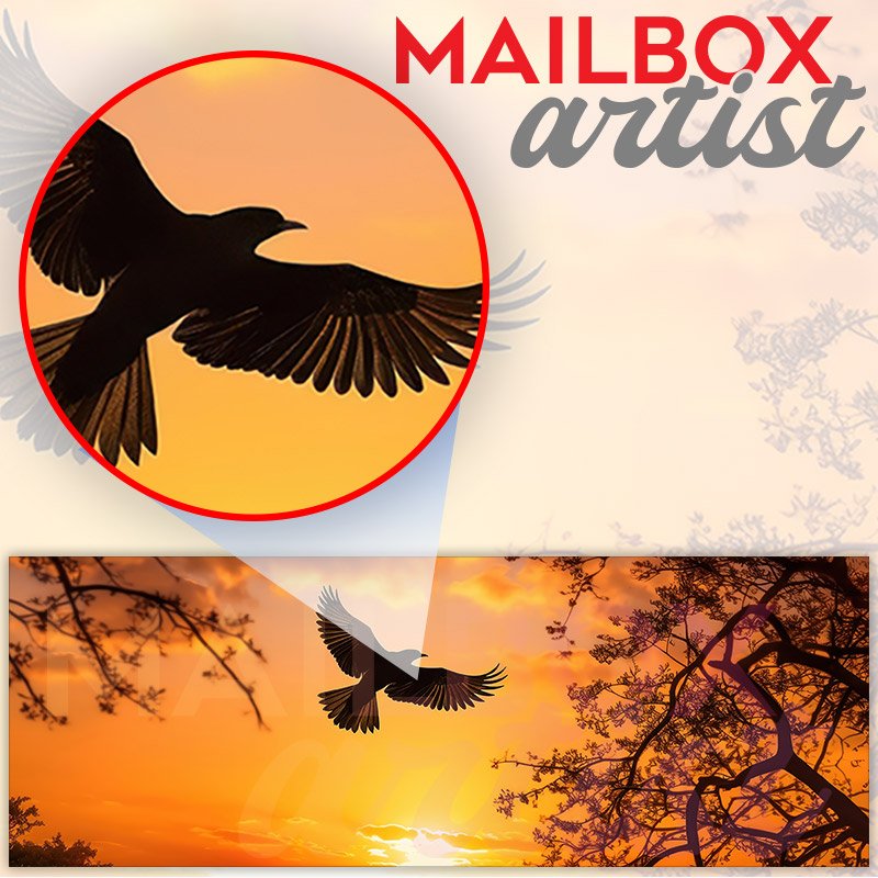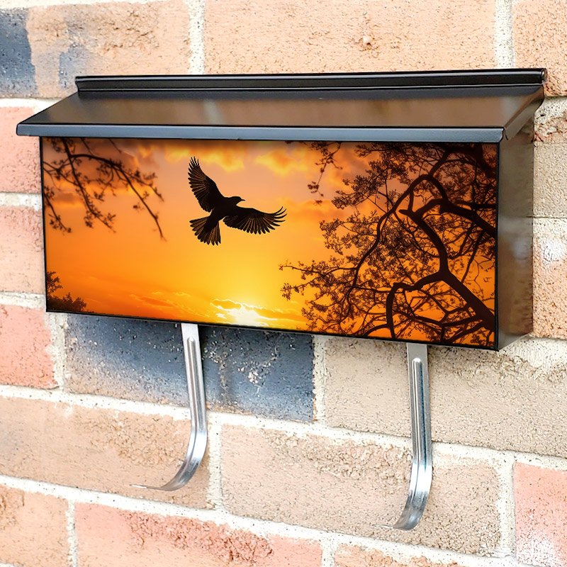 Applying your Silhouette Of Bird Flying On Sunset Orange Sky townhouse / ranch mailbox cover it’s pretty easy to convert your mailbox to a special and unique item. These covers require a flat surface, so they work with townhouse / ranch mailboxes that do not have any embossed decoration or signs. Magnetic mailbox covers work with steel boxes, for aluminum and plastic boxes we offer the self-adhesive vinyl covers. In case your mailbox doesn’t work with these covers, you can purchase the preinstalled cover on a brand new mailbox as well. Also, you can create your custom townhouse / ranch mailbox cover using you own pictures, adding your name, street number, etc.