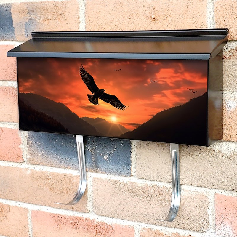 Applying your Silhouette Of Bird Flying On Sunset With Hills townhouse / ranch mailbox cover it’s pretty easy to convert your mailbox to a special and unique item. These covers require a flat surface, so they work with townhouse / ranch mailboxes that do not have any embossed decoration or signs. Magnetic mailbox covers work with steel boxes, for aluminum and plastic boxes we offer the self-adhesive vinyl covers. In case your mailbox doesn’t work with these covers, you can purchase the preinstalled cover on a brand new mailbox as well. Also, you can create your custom townhouse / ranch mailbox cover using you own pictures, adding your name, street number, etc.