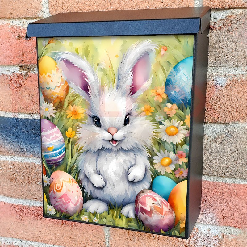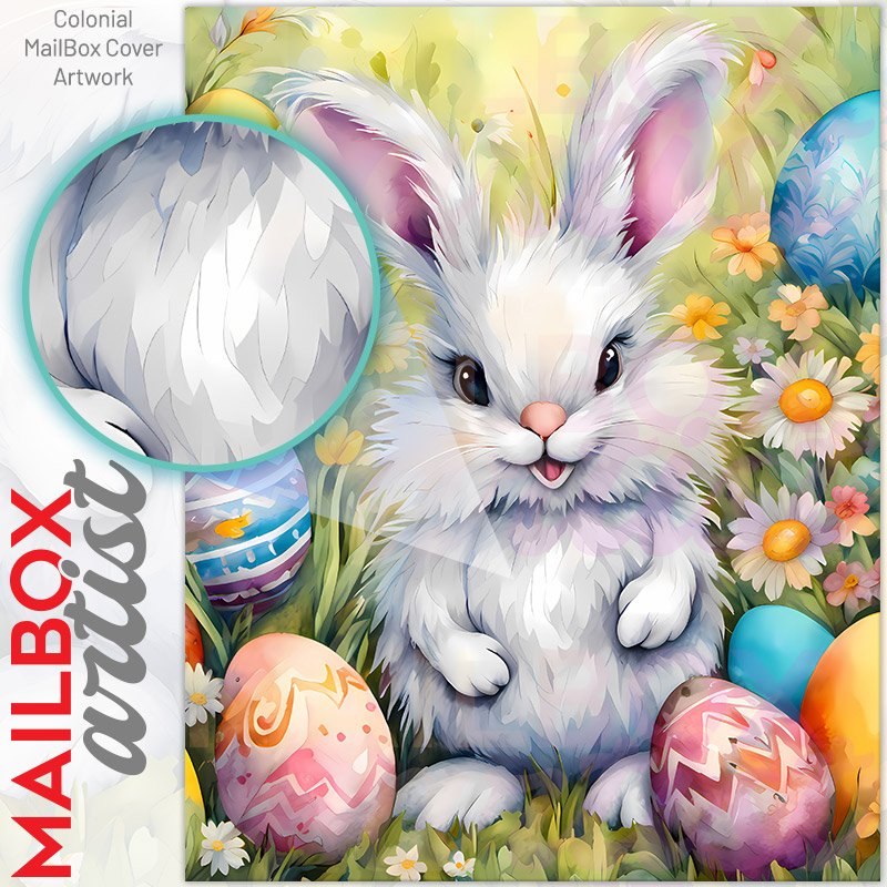 With this Silly Easter Bunny colonial mailbox cover it’s pretty easy to convert your mailbox to a special and unique item. These covers require a flat surface, so they work with colonial mailboxes that do not have any embossed decoration or signs. Magnetic mailbox covers work with steel colonial boxes only, while self-adhesive vinyl covers are available for aluminum, plastic and steel boxes. We also offer both self-adhesive and magnetic covers with regular opaque white vinyl or reflective vinyl, which works similarly to license plates or road signs. The reflective option makes the entire cover’s surface reflective, ensuring visibility at night. In case your mailbox doesn’t work with these covers, you can purchase the preinstalled cover on a brand new mailbox as well. Also, you can create your custom colonial mailbox cover using you own pictures, adding your name, street number, etc.