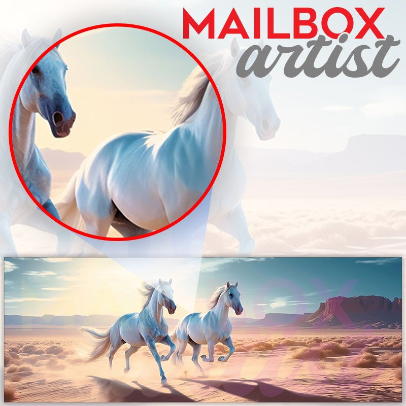 Applying your Silver Horses Galloping In The Desert Sand 2 townhouse / ranch mailbox cover it’s pretty easy to convert your mailbox to a special and unique item. These covers require a flat surface, so they work with townhouse / ranch mailboxes that do not have any embossed decoration or signs. Magnetic mailbox covers work with steel boxes, for aluminum and plastic boxes we offer the self-adhesive vinyl covers. In case your mailbox doesn’t work with these covers, you can purchase the preinstalled cover on a brand new mailbox as well. Also, you can create your custom townhouse / ranch mailbox cover using you own pictures, adding your name, street number, etc.